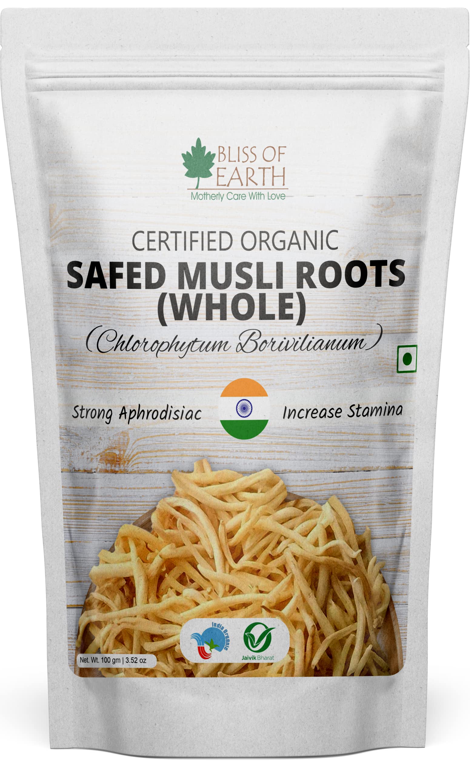 Bliss of Earth Certified Organic Safed Musli is a rare Indian herb and also a popular magical folk remedy that offers immense healing properties. Known for its powerful aphrodisiac and adoptogenic effects safed musli is extensively used in all type of healing process.