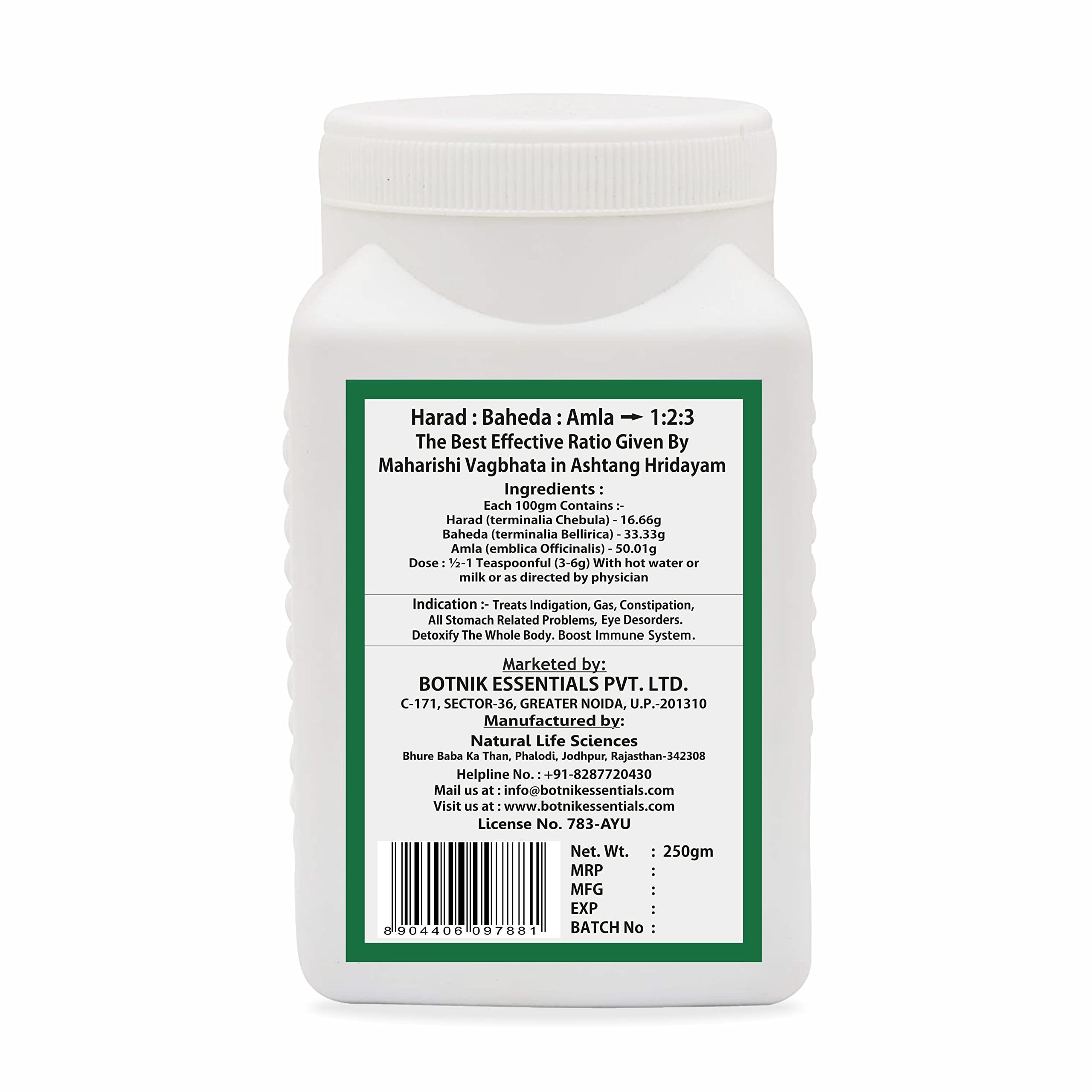 BOTNIK ESSENTIALS 100% Organic Triphala 1:2:3 Churna-250gm for Acidity|Gas|Constipation|Indigestion|Colon Cleansing Formula by Maharishi Vagbhata in Astang Hridayam.