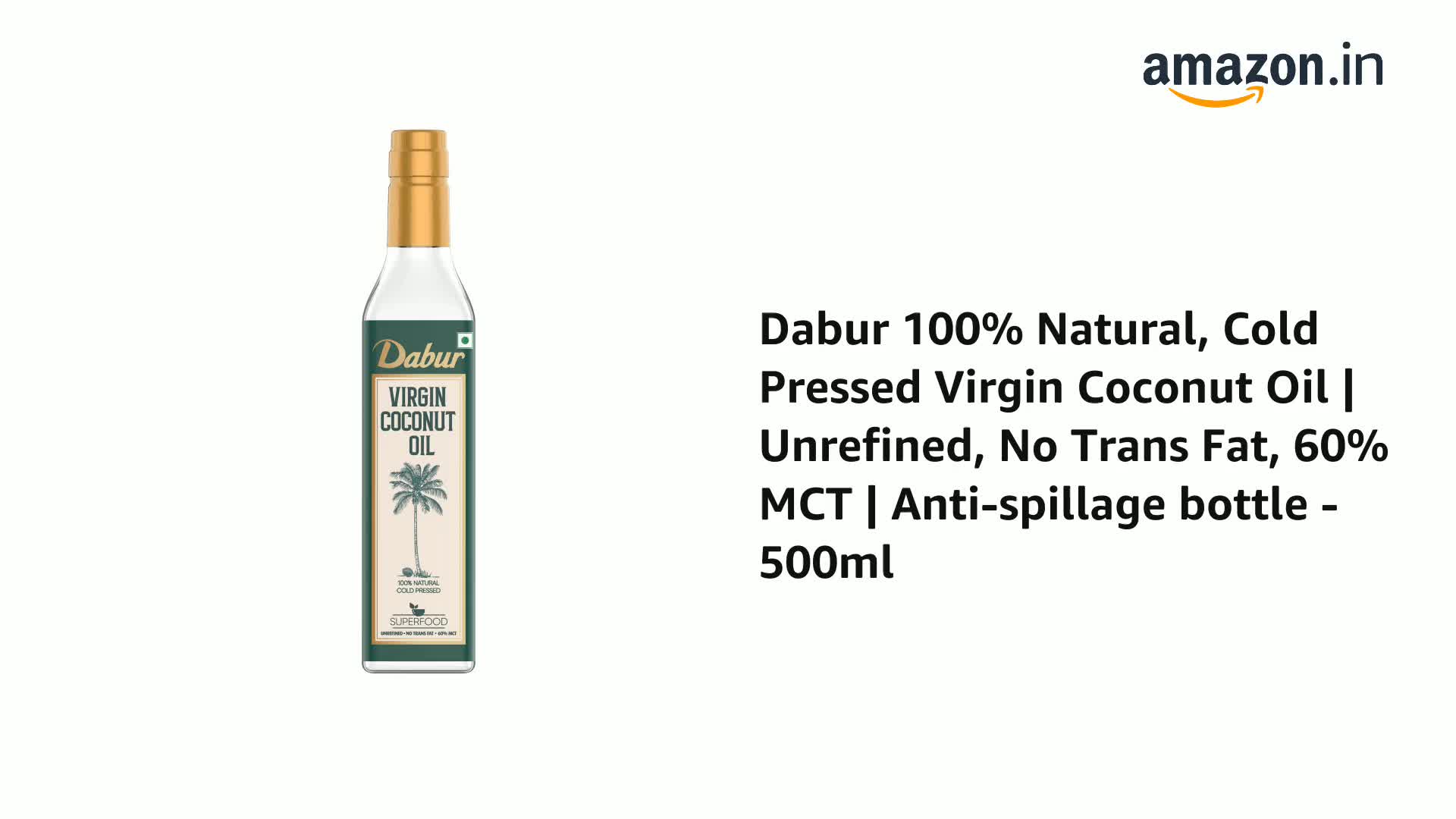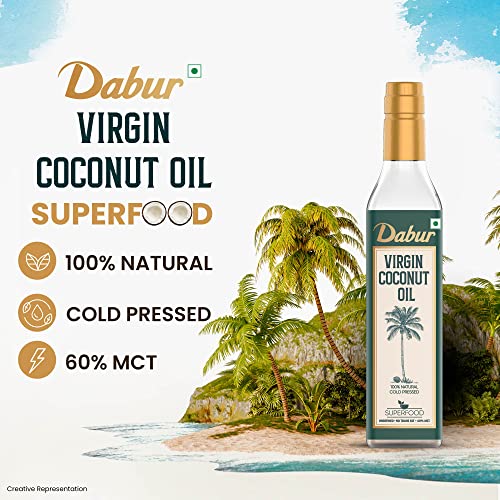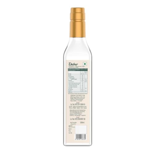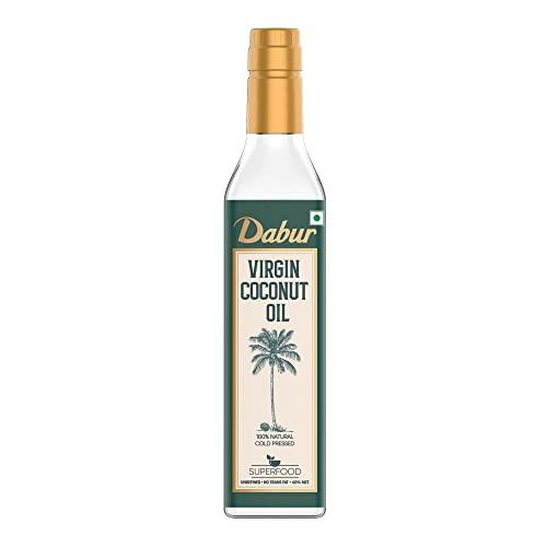 Dabur Virgin Coconut Oil is 100% Pure & Natural unrefined oil extracted from premium quality indian coconut through Cold pressed technology which helps preserve the vital nutrients rich aroma and traditional flavour. It undergoes fatty acid profiling that ensures 100% Purity and no adulteration making it fit for raw consumption. It has goodness of naturally occurring Medium Chain Triglyceride (MCTs) that get rapidly digested and helps in energy release. It is rich source of Lauric Acid (C12) and Vitamin E that helps boost immunity regulate metabolism and aid digestion. With its high stability its perfect to be used for deep fry saute stir fry or for salad dressings shakes dips & marinades. It comes hygienically packed in an anti-spillage & flow control bottle.