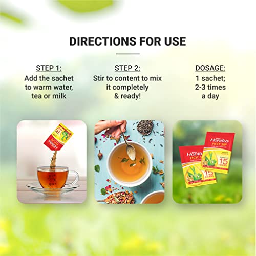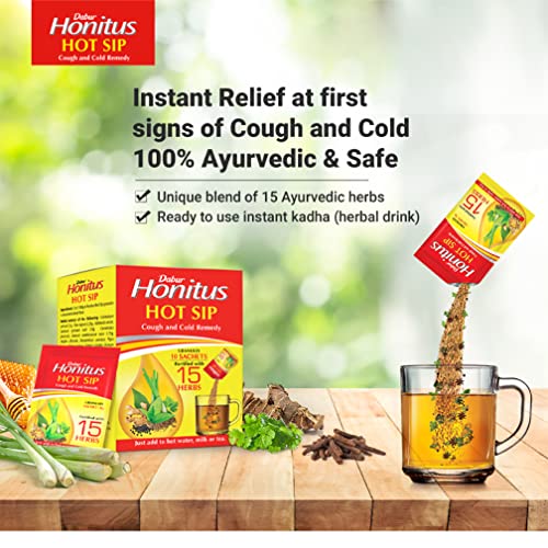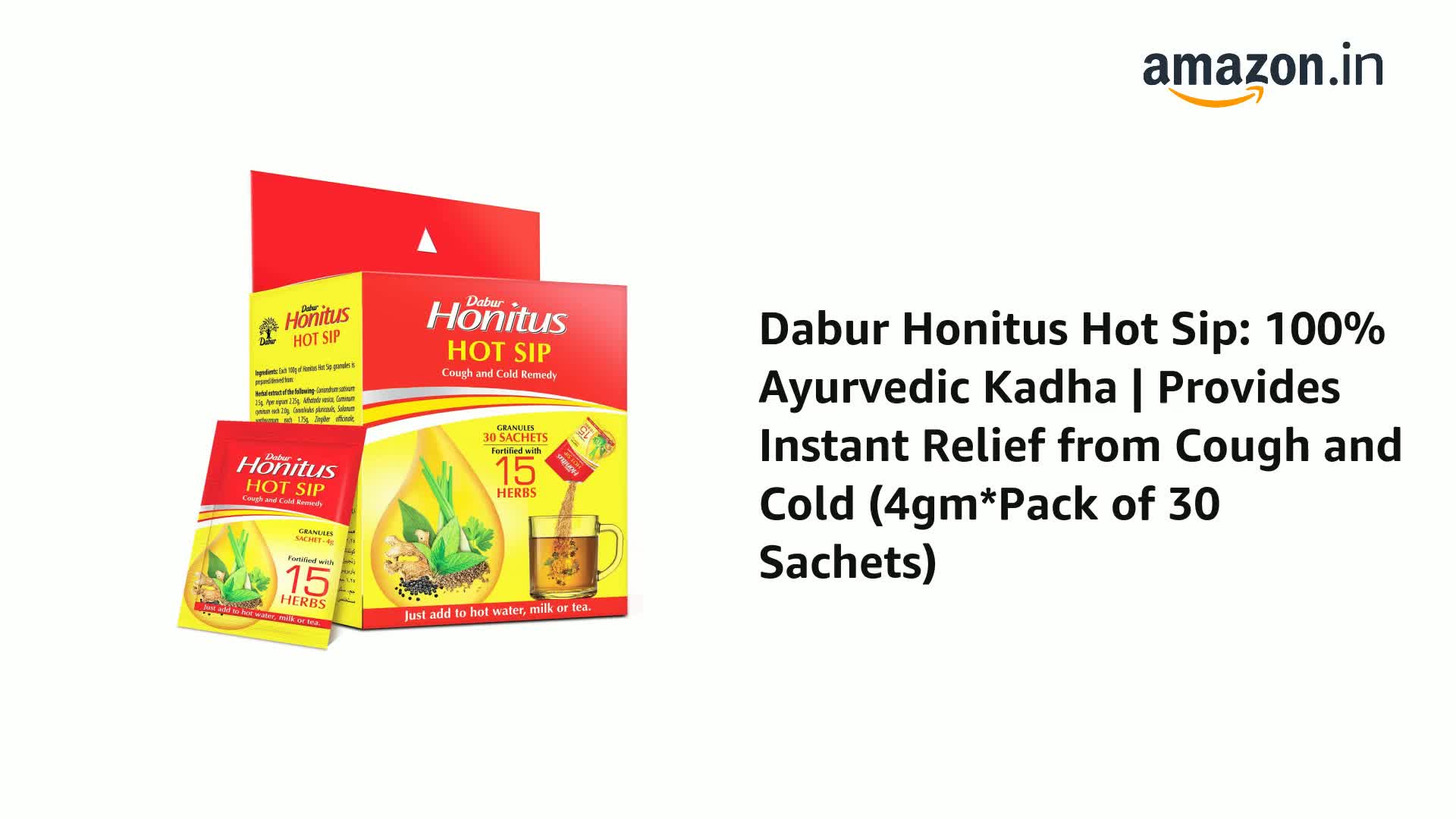 Dabur Honitus hot sip is a unique blend of 15 powerful ayurvedic herbs including shunthi kantakari and tulsi combined with honey to give you a potent and effective natural formulation for effective relief from cough and cold. Just stir it in hot water drink and experience the goodness of ayurveda.