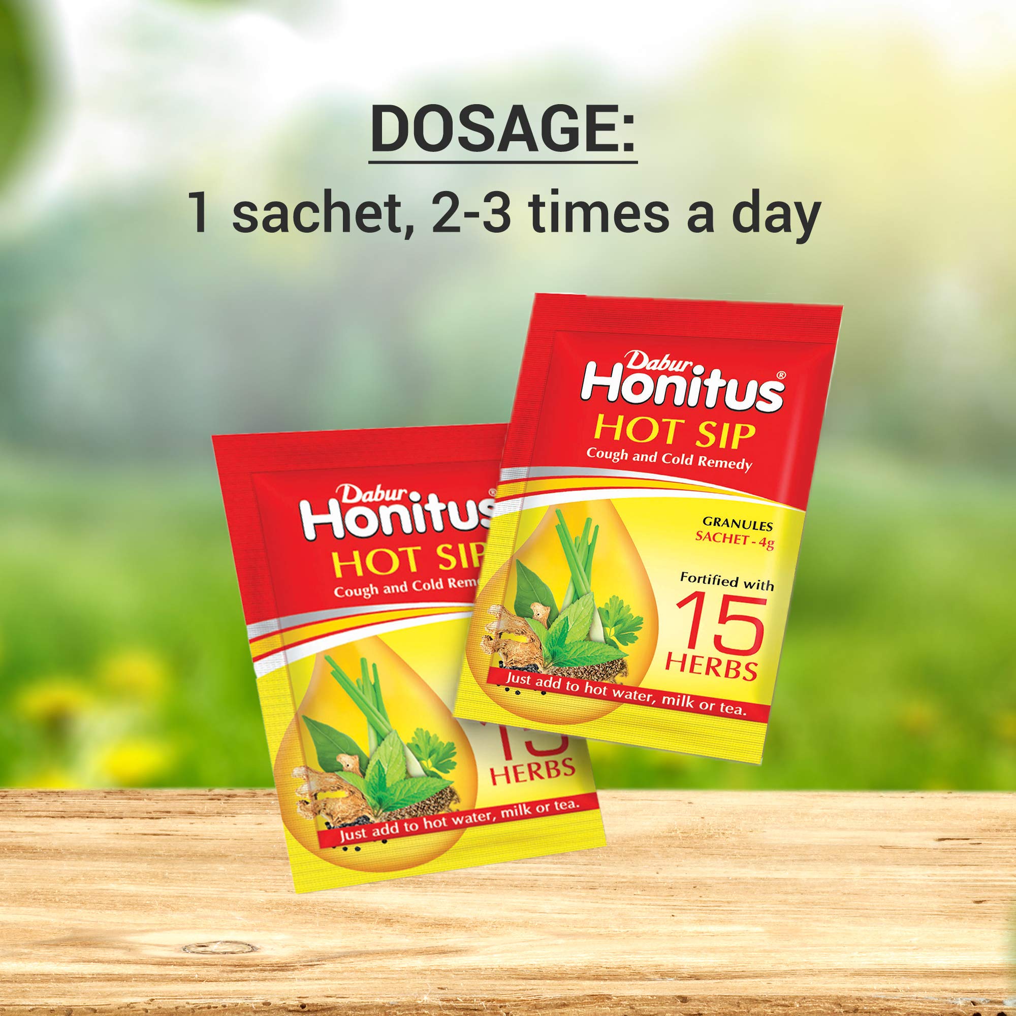 Dabur Honitus hot sip is a unique blend of 15 powerful ayurvedic herbs including shunthi kantakari and tulsi combined with honey to give you a potent and effective natural formulation for effective relief from cough and cold. Just stir it in hot water drink and experience the goodness of ayurveda.