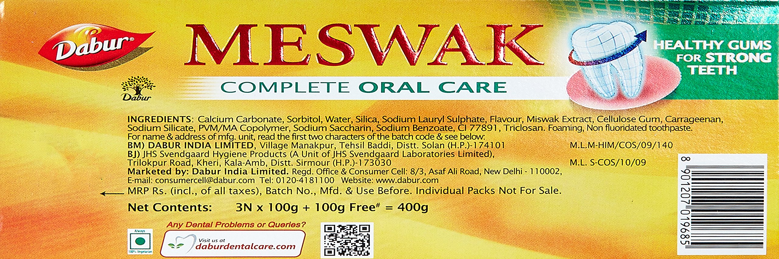 Meswak is a scientifically formulated herbal toothpaste with pure extract of the Meswak plant Salvador persica the famous toothbrush tree used for centuries. The astringent and anti bacterial properties of Meswak help reduce tooth decay fight plaque and prevent gum diseases. It is scientifically proven to reduce tarter and plaque fights germs and bacteria to keep gums healthy eliminates bad breath and ensures strong teeth.