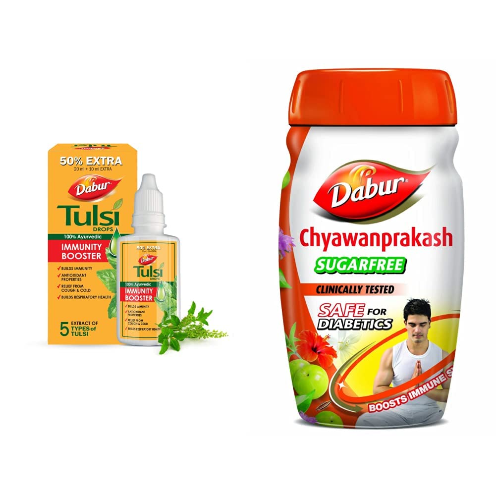 DABUR Tulsi Drops- 50% Extra: Concentrated Extract of 5 Rare Tulsi for Natural Immunity Boosting & Cough and cold Relief: (20ml +10ml Free)Dabur Tulsi Drops has antioxidant properties which helps boost immunity .It helps provide relief from cough and cold & helps in relieving mucus . It has antimicrobial properties . It contains the extracts of 5 rare tulsi which has a lot of benefits . The intake of tulsi is the best way of intestine cleaning. It also helps in stress management .It is good for skin joint and liver health .Dabur Chyawanprakash Sugar free - 900 gDabur Chyawanprash has a tangy sweet-sour taste and the consistency of jam. It can be taken directly or with milk and as bread spread. In winters have a glass of warm milk after having Chyawanprash. In summers have a glass of cold milk after having Chyawanprash. Disclaimer: Ayurvedic Medicine basis clinical & preclinical studies with Dabur Chyawanprakash Illness refers to common day to day ailments like cough & cold Dosage & directions as per label 1 teaspoonful is approximately equivalent to 12g.