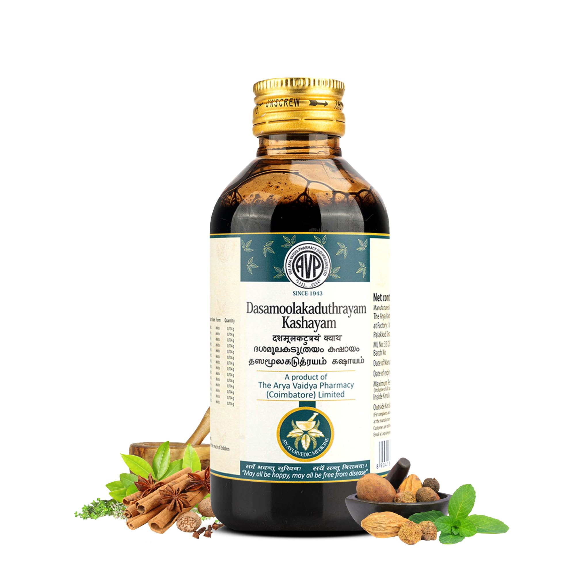 Dasamoolakaduthrayam Kashayam is a herbal decoction used for the treatement in cough cold and common cold. Consuming it on regular basis helps in reducing the common cold as it is beneficial in nasal congestion and make breating feel easier. It also helps in Sinus problems which helps to possess anti-inflammatory properties. Soothes cough and shortness of breath. Alleviate headache and pain on the flanks. Improves digestion.