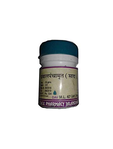 Each 125mg. contains Praval bhasma (Coral)-41.66mg. Mukta bhasma (Pearl)-20.83mg. Vang bhasma (Calcined stannum)-20.83mg. Shankh bhasma (Calcined conch shell)-20.83 mg. Shukti bhasma (Calcined shell of oyster)-20.83 mg. Bhavanarth dravyas—Ikshu rasa (Saccharum officinarum) Cow's milk Vidhari kand rasa (Pueraria tuberosa) Kumari swarasa (Aloe barbedensis) Shatavari (Asparagus racemosus) Tulsi swarasa (Ocimum sanctum) Hansapadi rasa (Adiantum lunulatum)— Q.S (for mardana).