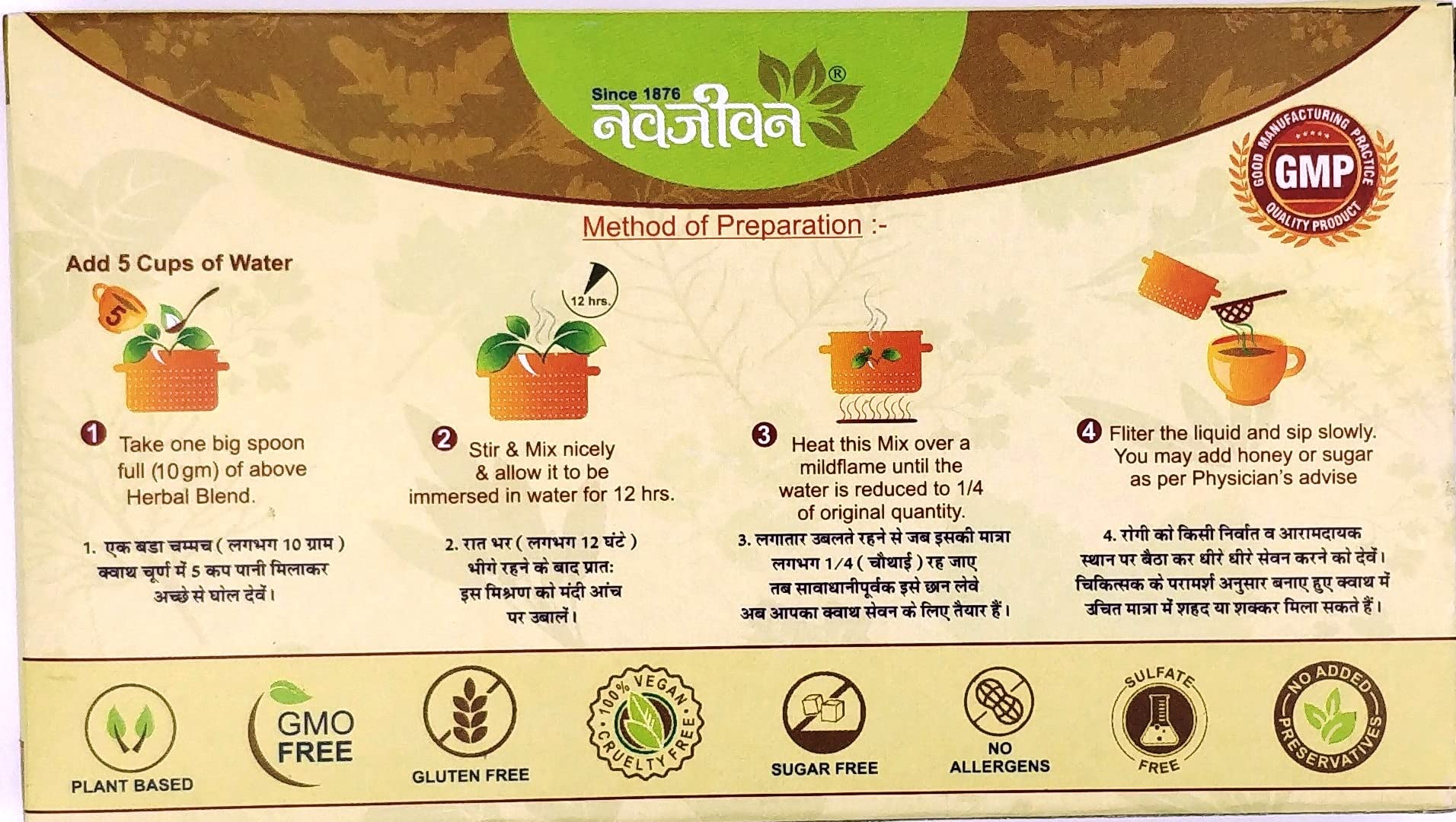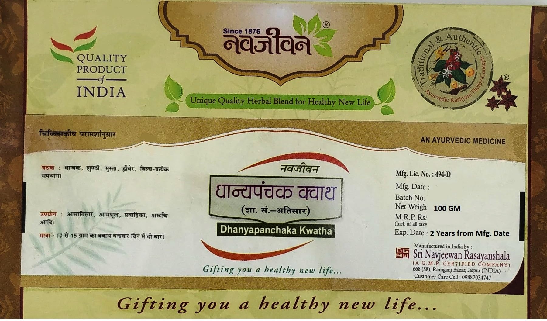 DHANYAPANCHAK KWATH OR KASHYAM is ayurvedic herbal kwath or tea intended for aamtisaaraamshoolpravahekaaruchi. To be taken as per instruction given on the package two times a day or as directed by an Ayurvedic Doctor. It is an Ayurvedic medicine mainly used in the treatment of malabsorption dysentery indigestion diarrhoea etc. Dhanyaka – Coriander – Coriandrum sativum Nagara – Ginger Rhizome – Zingiber Officinalis Musta – Nutgrass – Cyperus rotundus Balaka – Pavonia odorata Bilva – Bael (root) – Aegle Marmelos