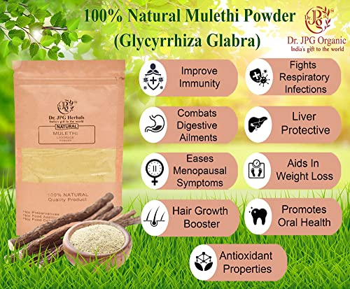 Dr. JPG's Mulethi Powder is 100% pure and natural powder which is an effective product sourced from the finest quality. Mulethi commonly known as ‘Licorice' is one of the most prime herbs in Indian Ayurveda. Also mulethi churna is one such classical Ayurvedic remedy that has a century's long repute of being the ultimate grandma's remedy for cough and sore throat. Apart from it it is widely used as a flavoring agent due to the natural sweetness. Additionally this traditional herb exhibits multiple benefits and is extensively used in several folk remedies and ayurvedic formulations Helpful in respiratory problems liver disorders obesity skin infection gastric problem hormonal regulation general debility joint pain and many more.