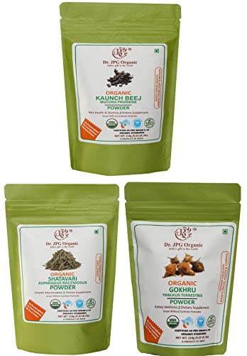 Dr. JPG Organic Powder For Men's Health Shatavari Kaunch Gokhru Powder -342g / INDIA ORGANIC Certified/Each Pouch Contain 114g.