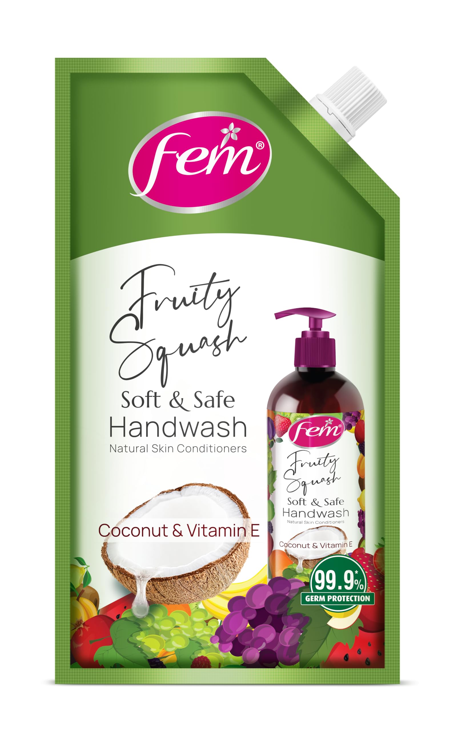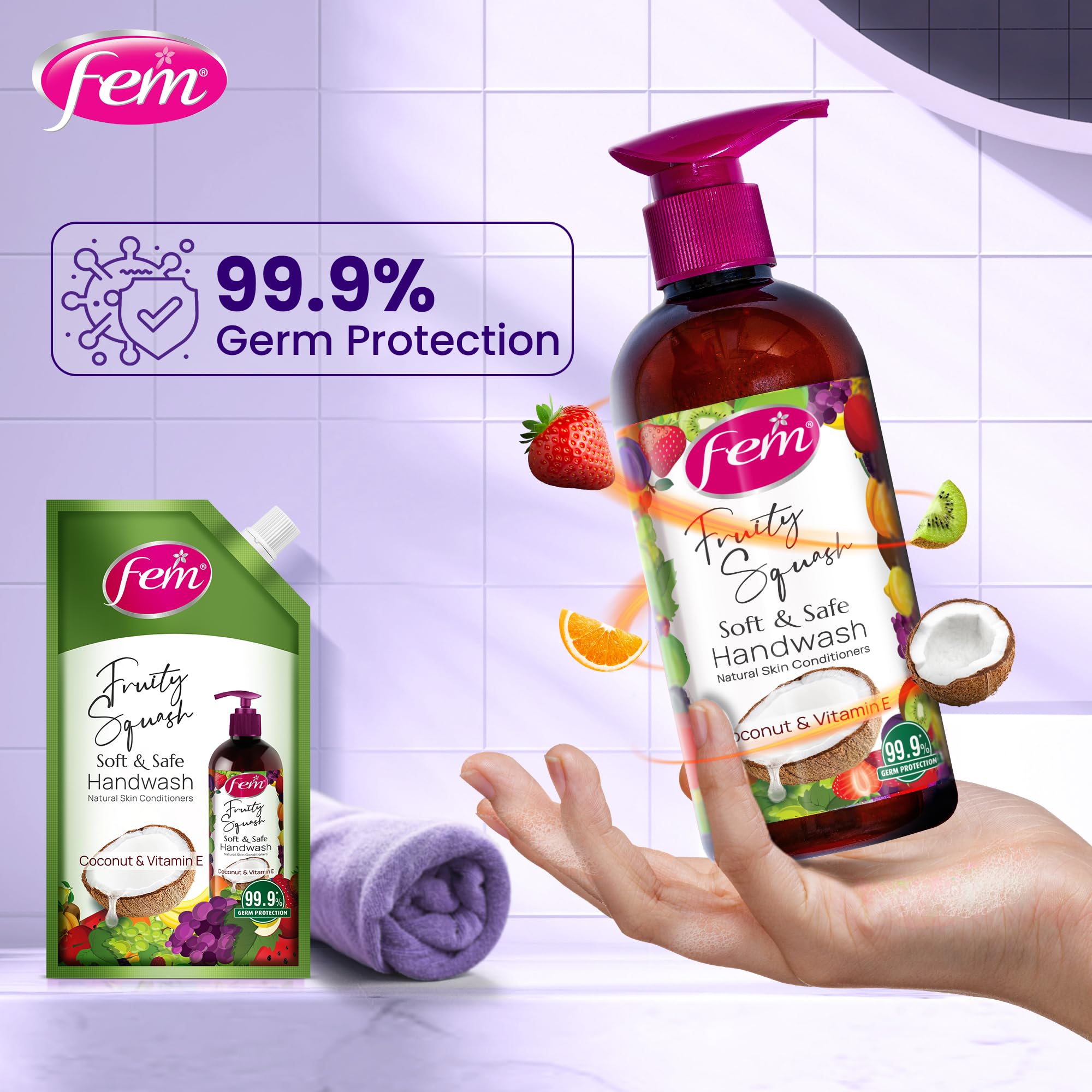 Fem Fruity Squash Soft & Safe Handwash - 750ml | Enriched with Goodness of Coconut Milk & Vitamin E | Long Lasting Fragrance