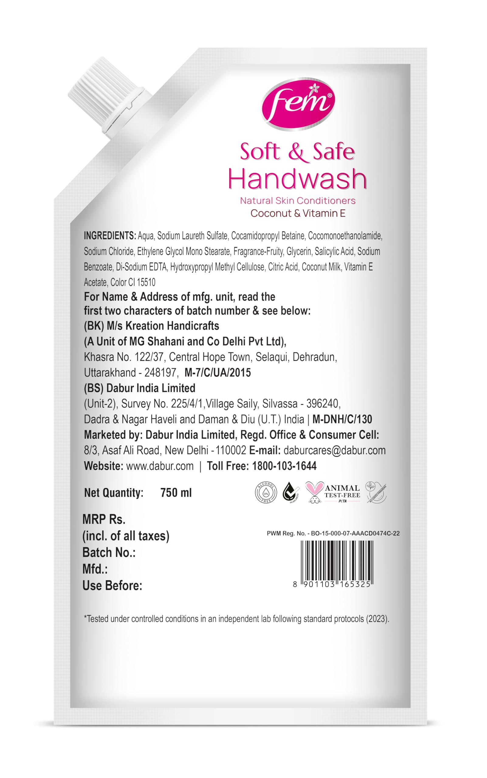 Germ removal doesnât mean your hand wash has to be harsh for your skin. Fem Soft & Safe Handwash is enriched with Natural Skin Conditioners like Coconut Milk and Vitamin E that remove 99.9% germs and leave your skin moisturized. It provides complete care for your hands i.e it leaves hands Soft & Hygienically clean. Maintains pH balance of skin and has no added Parabens Triclosan and Triclocarbon