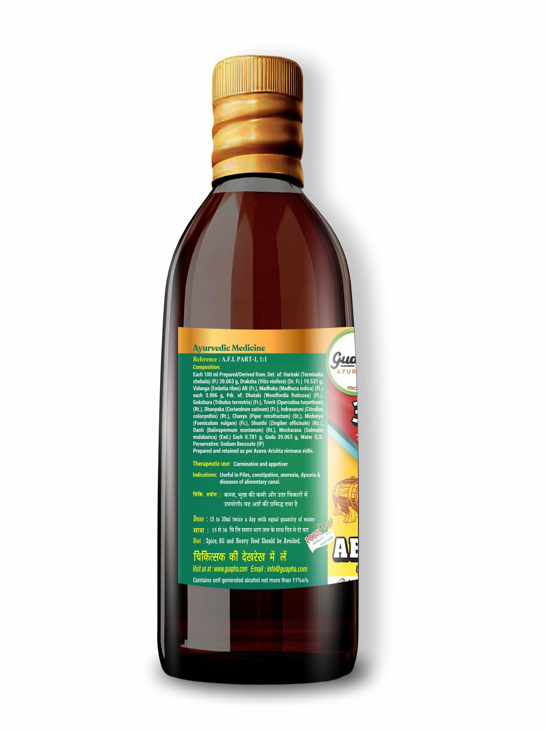 Embark on a journey to holistic wellness with Guapha Ayurveda Abhyarishta â your key to natural vitality! Meticulously crafted from time-honored Ayurvedic wisdom this herbal elixir is designed to rejuvenate your body and mind. Guapha Ayurveda Abhyarishta boasts a harmonious blend of traditional Ayurvedic herbs like Haritaki Bibhitaki and Amalaki renowned for their digestive support and gentle detoxification properties. Elevate your well-being as this potent formulation works synergistically to cleanse your digestive system alleviating discomfort and promoting optimal gut health. Experience a surge of vital energy as Guapha Ayurveda Abhyarishta revitalizes your body providing a natural boost that complements your active lifestyle. We prioritize quality ensuring each bottle meets stringent standards for purity and safety in our cutting-edge facility. Embrace the richness of Ayurveda and prioritize your health with Guapha Ayurveda Abhyarishta. Make the choice for a balanced vibrant life â add this exceptional Ayurvedic elixir to your cart now and take the first step towards a healthier more energetic you!