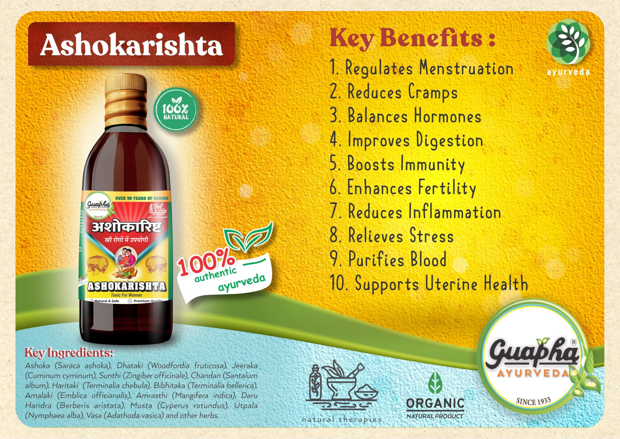 Unlock the secrets of women's wellness with Guapha Ayurveda Ashokarishta a natural elixir designed to support and nurture female reproductive health. Crafted with precision from the wisdom of Ayurveda this unique formulation features the powerful Ashoka tree extract and other time-honored herbs to provide holistic menstrual support. Guapha Ayurveda Ashokarishta is your ally in promoting hormonal balance and menstrual comfort. Experience the gentle yet effective benefits of this herbal tonic specially designed to help maintain a regular menstrual cycle and alleviate discomfort associated with it. This Ayurvedic elixir is more than just a remedy; it's a celebration of women's well-being. Guapha Ayurveda Ashokarishta works synergistically to nurture your body providing the support it needs for a balanced and harmonious menstrual experience. Crafted in a state-of-the-art facility Guapha Ayurveda Ashokarishta upholds the highest quality standards. Each bottle undergoes rigorous testing to ensure purity potency and safety offering you a trusted solution for your reproductive health. Prioritize your well-being with the wisdom of Ayurveda. Elevate your journey towards women's wellness with Guapha Ayurveda Ashokarishta â add this exceptional elixir to your cart now and embrace the natural balance your body deserves.