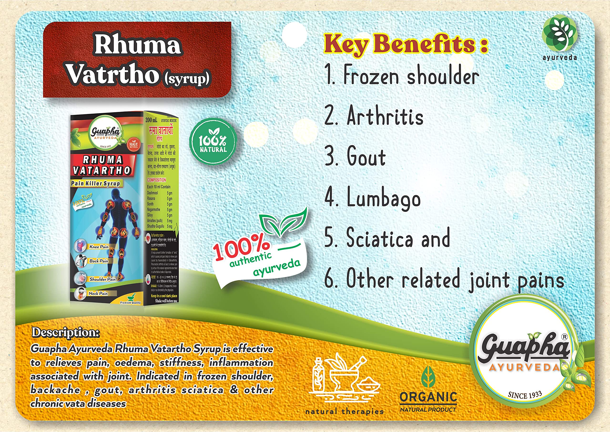 Rhuma Vatartha Syrup is a unique product used in relief of arthritic problem by providing analgesic and anti-inflammatory action.