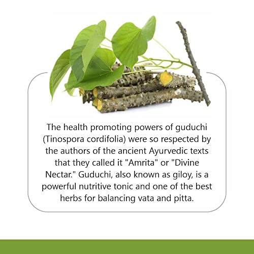 Guduchi (Tinospora cordifolia) is refered as "Amrita" or "Divine Nectar" by the vaidya's of Ancient Ayurvedic Texts. A powerful nutritive tonic guduchi or giloy is one of the best herbs for balancing vata and pitta. It has the unusual characteristic of being heating while simultaneously removing excess pitta from the body. Guduchi strengthens the tissues bolsters immunity and promotes vitality while calming the mind and supporting proper function of the nervous system. It is also traditionally used to promote longevity and to support healthy reproduction.*