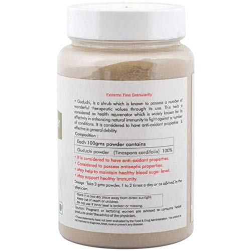 Ingredients: guduchi powder. All our products are made from quality items. We recommend that you read labels warnings and directions of all products before use and not rely solely on the information. Care instruction keep away from the items or products which may cause damage to this product.