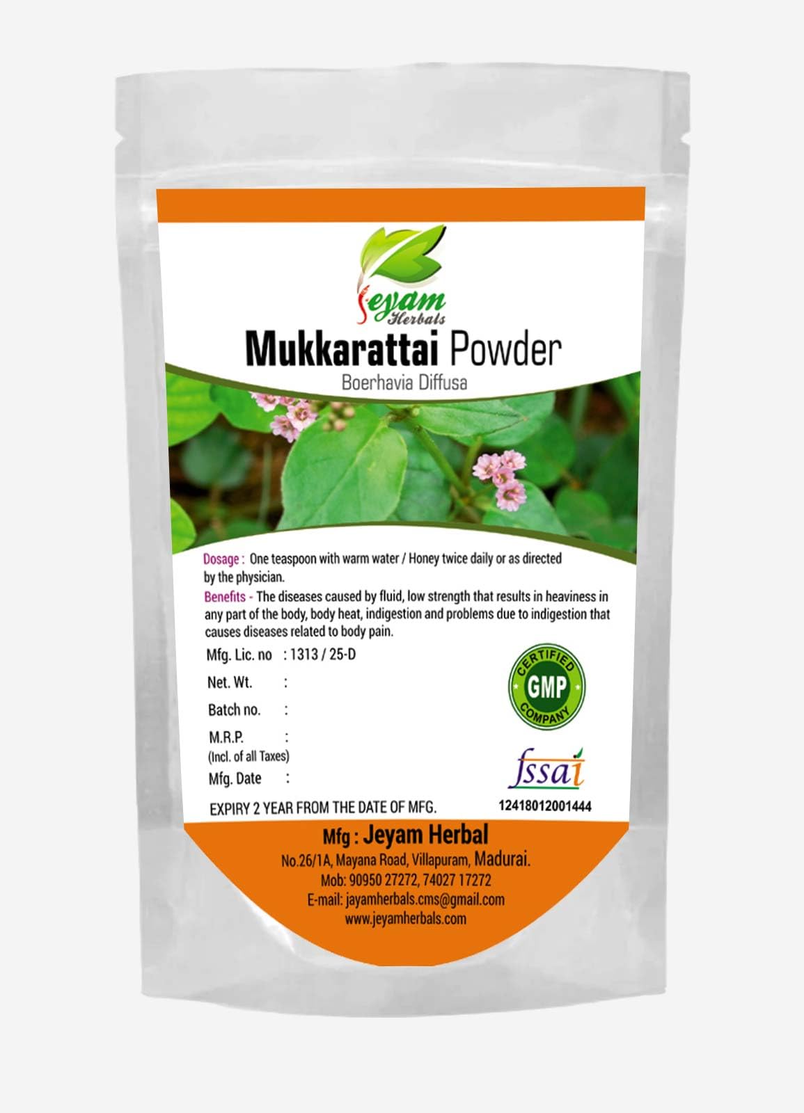 Punaava helps to retain the health of the skin for a long period of time by protecting the tissues from dangerous diseases. The anti-inflammation properties reduces the risk of getting arthritis and joint pains. Mukkrattai powder has a unique formula that strengthens the joints and bones. Boerhaavia increases appetite relieves from constipation problems proper digestion and abdominal pains due to improper digestion are prevented. It stimulates the liver functions and reactivates the cells that are damaged to fight against jaundice hepatitis and gallbladder. The other types of liver disorders are treated with the help of boerhaavia leaves. The other health benefits are toxins are flushed out kills worms sweats more and makes skin healthy swelling nervous weakness paralysis reduces blood pressure and prevents heart problems.
