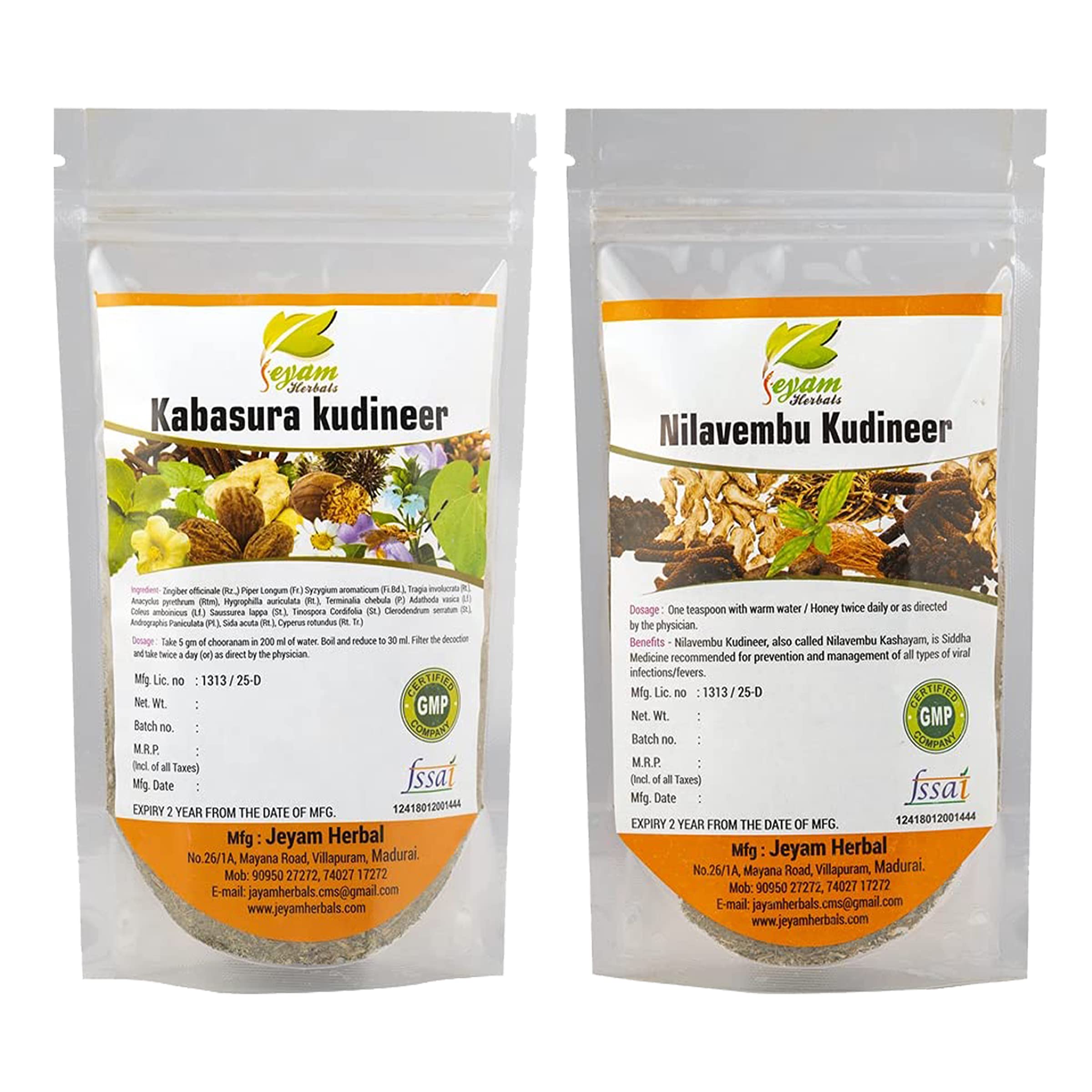 Benefits of Kabasura Kudineer : Kabasura kudineer is the Siddha classical drug which has been in clinical practice for long period of time in the management of different types of intermittent fever which mostly occurs in ailments like malaria dengue fever chronic fever chikungunya Fever associated with respiratory problems in Siddha system of Medicine. Benefits of Nilavembu Kudineer : The decotion made by Nilavembu Kudineer increases the immune system . It has anti-inflammatory and anti-ulcer properties so it has good effect on treating different types of ulcers. Like wise it holds high significance in treating the host of heart ailments.