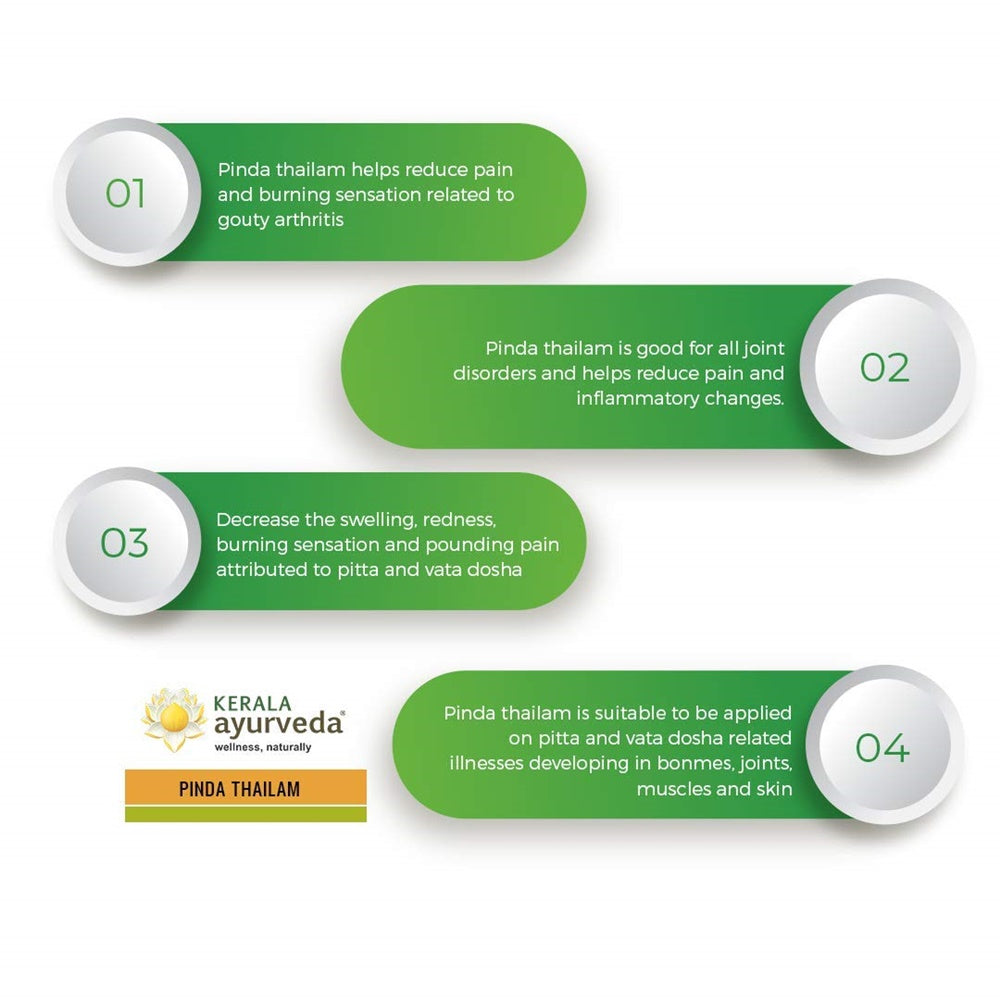 Kerala Ayurveda Pinda ThailamKerala Ayurveda Pinda Thailam is Anti-inflammatory, Analgesic.Manufacturer : Kerala AyurvedaQuantity: Available in 200ml / 450 mlNote: Statements regarding dietary supplements have not been evaluated by the FDALegal Disclaimer: Product images are for illustrative purposes only. Images/packaging/ labels may vary from time to time due to changes made by the manufacturer's manufacturing batch and location. The product description is f