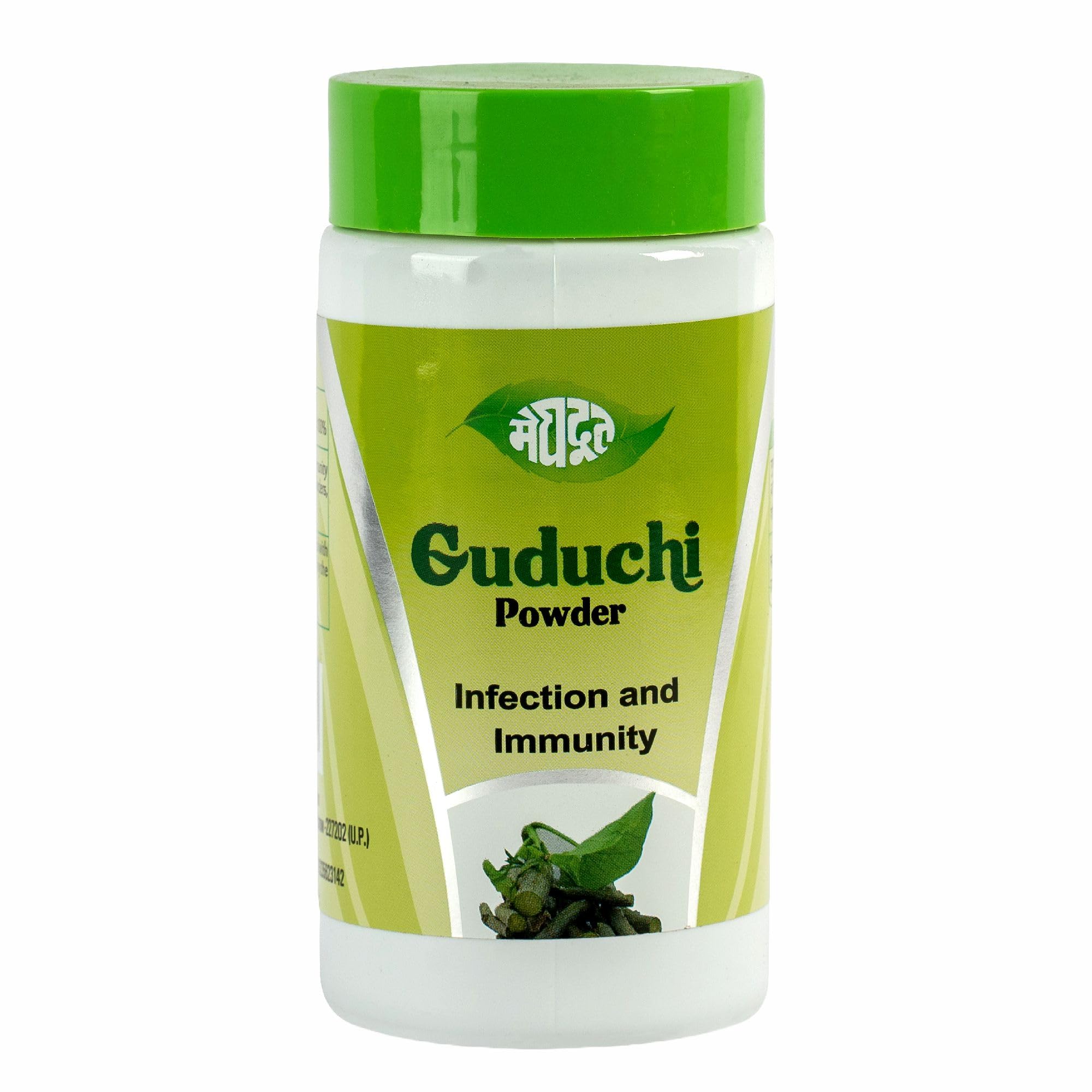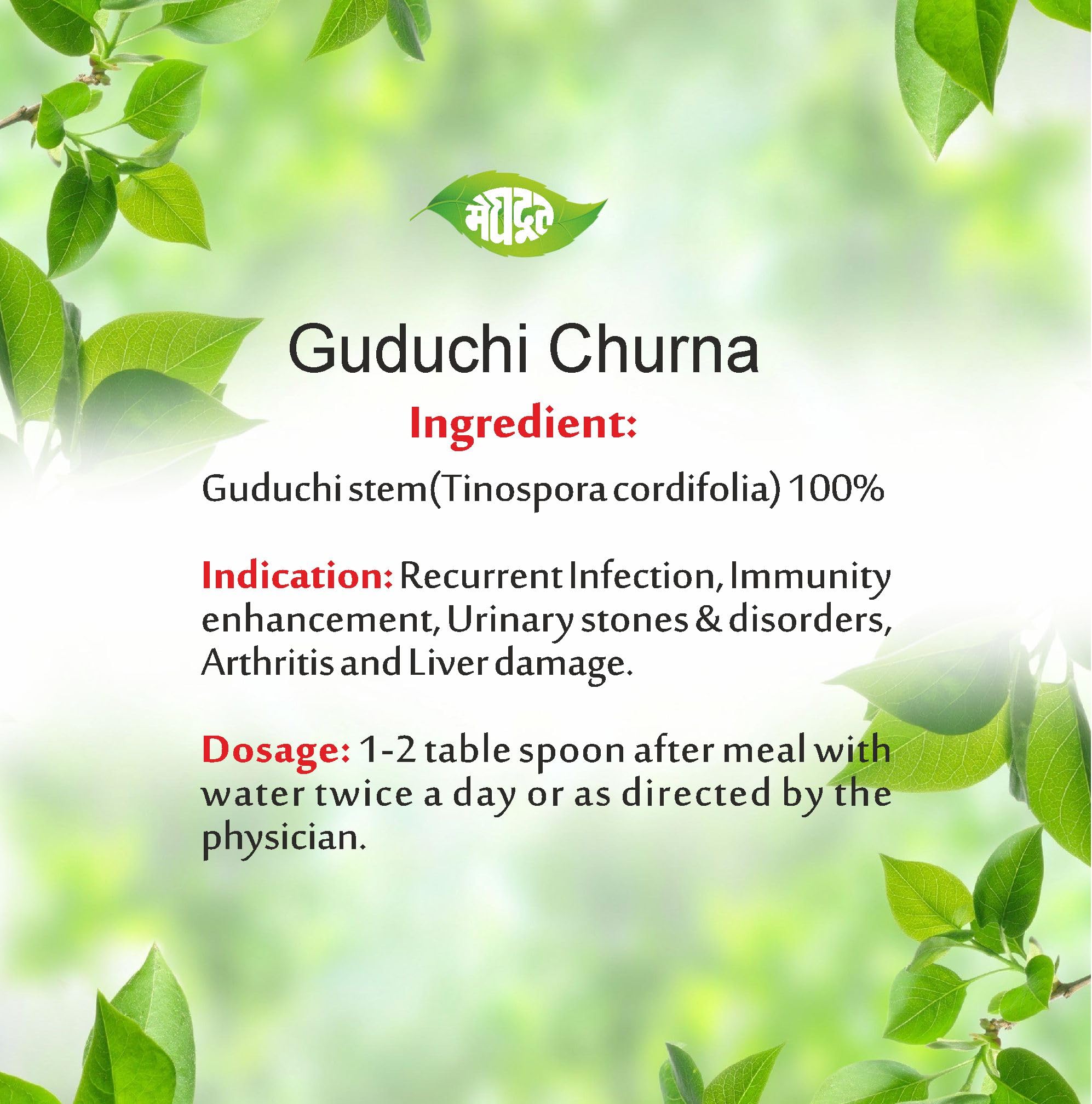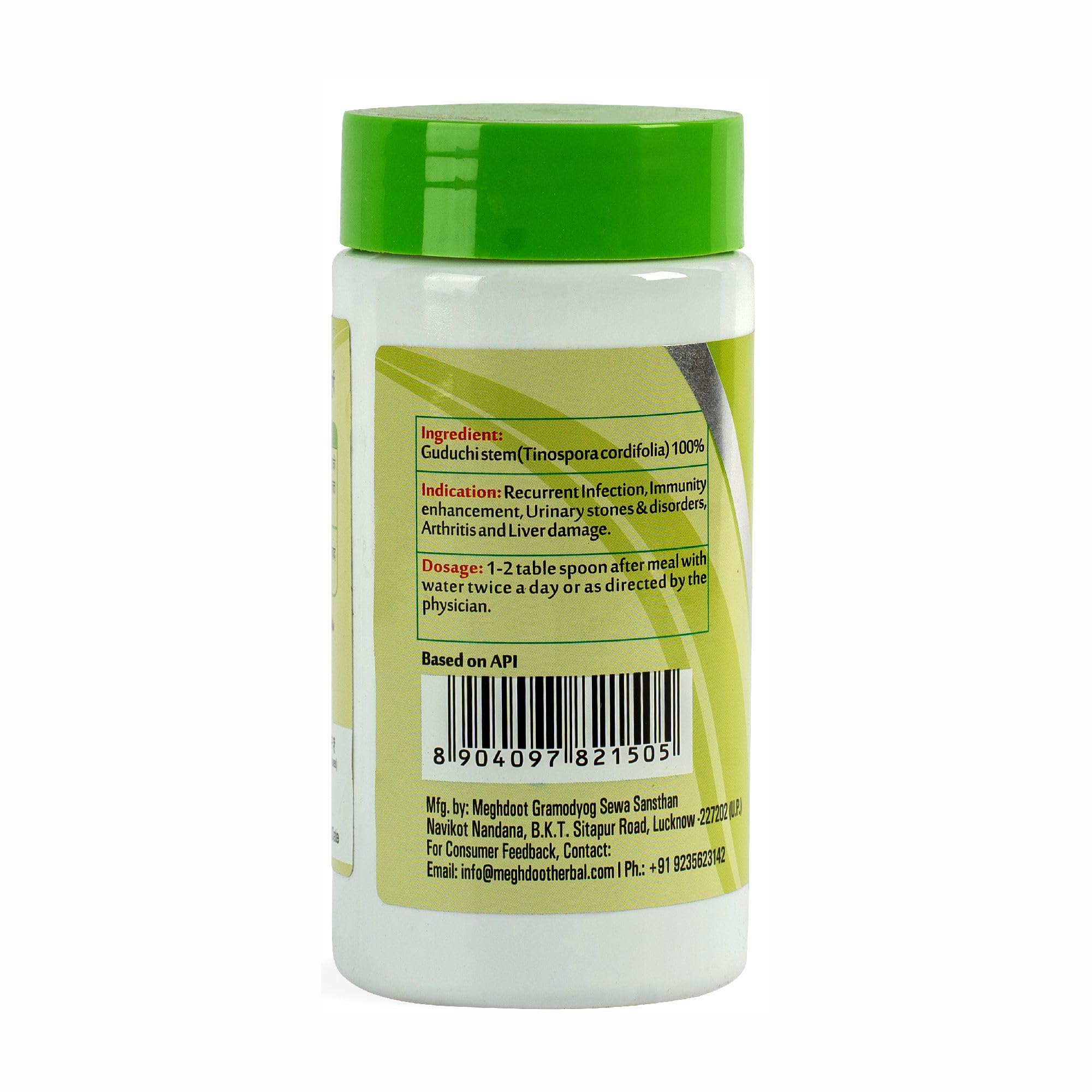 Introducing Meghdoot Ayurvedic Guduchi Churan Powder enriched with natural extracts of Guduchi stem meticulously crafted to boost immunity and combat infections. Each pack contains 100 grams of premium quality powder offering a potent solution for enhancing overall health and well-being. Guduchi also known as Tinospora cordifolia is revered in Ayurveda for its powerful immunomodulatory properties that strengthen the body's defense mechanisms against infections. It promotes the production of white blood cells enhancing the immune response to pathogens. Additionally Guduchi's antioxidant properties help neutralize free radicals and reduce oxidative stress contributing to overall health maintenance. Meghdoot Ayurvedic Guduchi Churan Powder is formulated to preserve the natural efficacy of Guduchi ensuring maximum potency. Free from artificial additives and preservatives this powder provides a pure and natural approach to immune support. Ideal for daily use simply mix the powder with water or honey to create a nourishing drink supporting immune function and vitality. With a pack of four you have an ample and sustainable supply to maintain immunity and combat infections effectively. Whether you are looking to boost your immune system or enhance your body's ability to fight infections naturally Meghdoot Ayurvedic Guduchi Churan Powder is your reliable companion. Embrace the healing traditions of Ayurveda and experience the immune-boosting benefits of Guduchi for a healthier more resilient body. Elevate your well-being with Meghdoot Ayurvedic Guduchi Churan Powder and empower your immune system naturally.