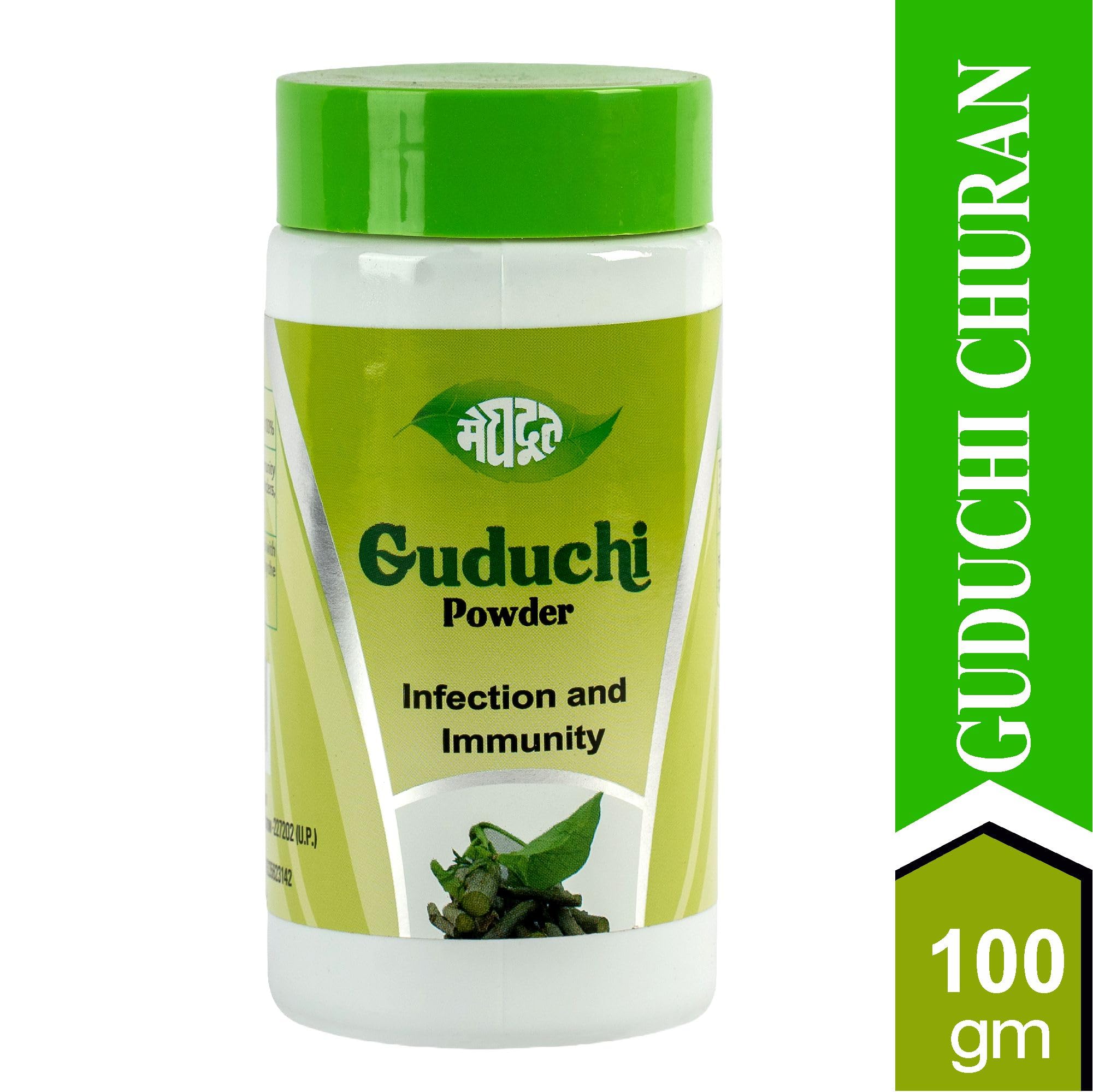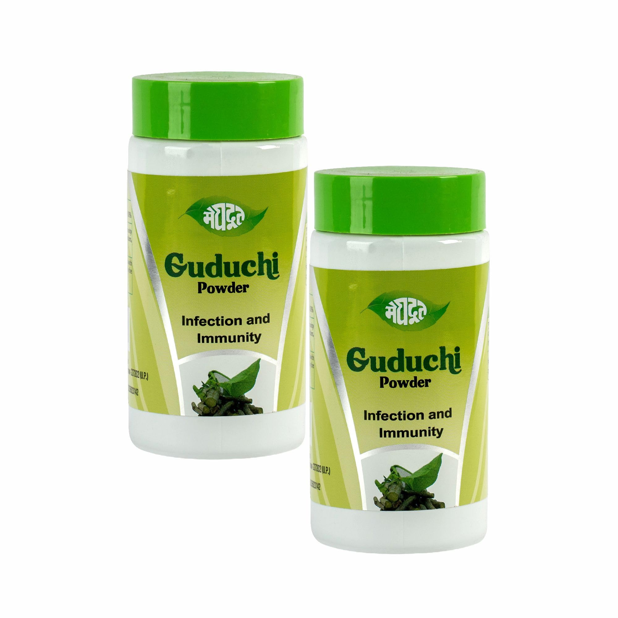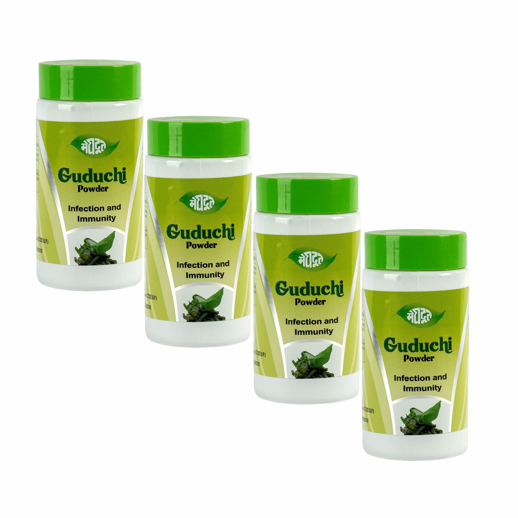Introducing Meghdoot Ayurvedic Guduchi Churan Powder enriched with natural extracts of Guduchi stem meticulously crafted to boost immunity and combat infections. Each pack contains 100 grams of premium quality powder offering a potent solution for enhancing overall health and well-being. Guduchi also known as Tinospora cordifolia is revered in Ayurveda for its powerful immunomodulatory properties that strengthen the body's defense mechanisms against infections. It promotes the production of white blood cells enhancing the immune response to pathogens. Additionally Guduchi's antioxidant properties help neutralize free radicals and reduce oxidative stress contributing to overall health maintenance. Meghdoot Ayurvedic Guduchi Churan Powder is formulated to preserve the natural efficacy of Guduchi ensuring maximum potency. Free from artificial additives and preservatives this powder provides a pure and natural approach to immune support. Ideal for daily use simply mix the powder with water or honey to create a nourishing drink supporting immune function and vitality. With a pack of four you have an ample and sustainable supply to maintain immunity and combat infections effectively. Whether you are looking to boost your immune system or enhance your body's ability to fight infections naturally Meghdoot Ayurvedic Guduchi Churan Powder is your reliable companion. Embrace the healing traditions of Ayurveda and experience the immune-boosting benefits of Guduchi for a healthier more resilient body. Elevate your well-being with Meghdoot Ayurvedic Guduchi Churan Powder and empower your immune system naturally.