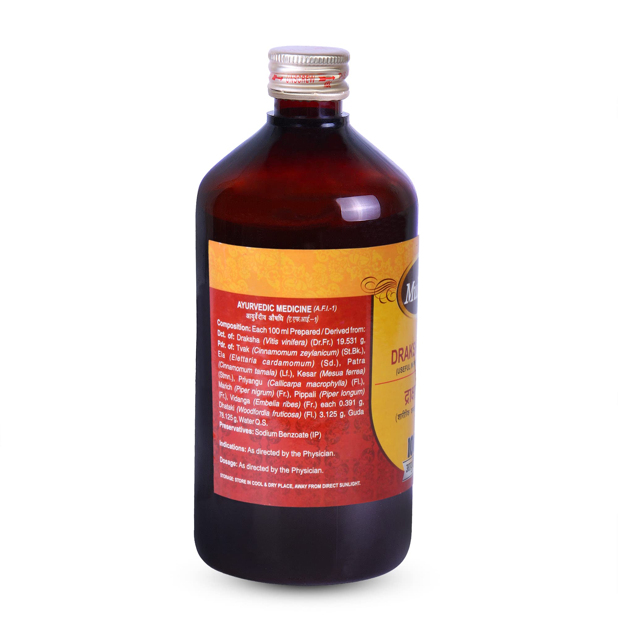 Multani Draksharishta Syrup is a powerful Ayurvedic formulation designed to promote overall health and wellness. Made from natural ingredients with Draksha (grapes) as the key component this herbal tonic is known for its rejuvenating properties. It is traditionally used to improve digestion enhance respiratory health and boost overall vitality. Draksharishta is enriched with essential herbs such as Jaggery Dhataki Cinnamon Clove and Cardamom which work synergistically to support the bodyâs natural functions. It acts as a natural energy booster helping in reducing fatigue and weakness. Additionally this syrup is beneficial for respiratory issues such as cough cold and asthma due to its expectorant properties.