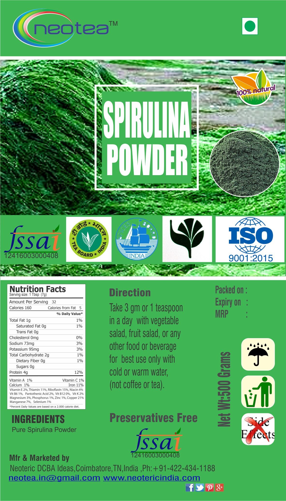 Neotea 100% Organic Spirulina Powder for Immunity Energy Digestion & Skin Health | Plant-Based Protein Superfood All-natural and Mineral-rich Detoxifying Supplement | Rich in Protein Vitamins & Minerals | Boost Energy & Immunity | Gluten Free Vegan Non-GMO -500 GM