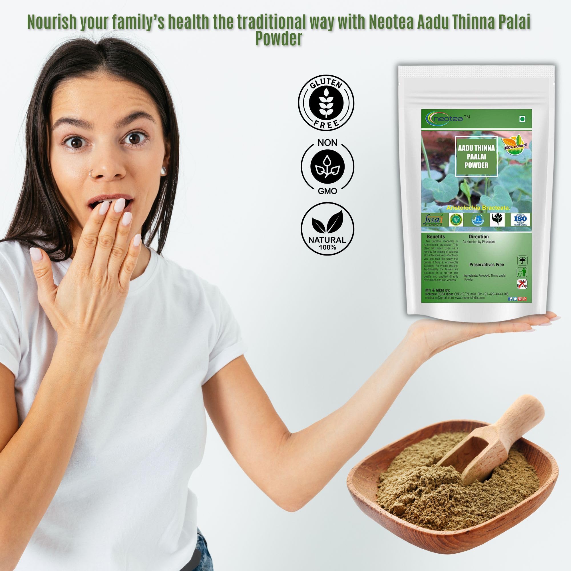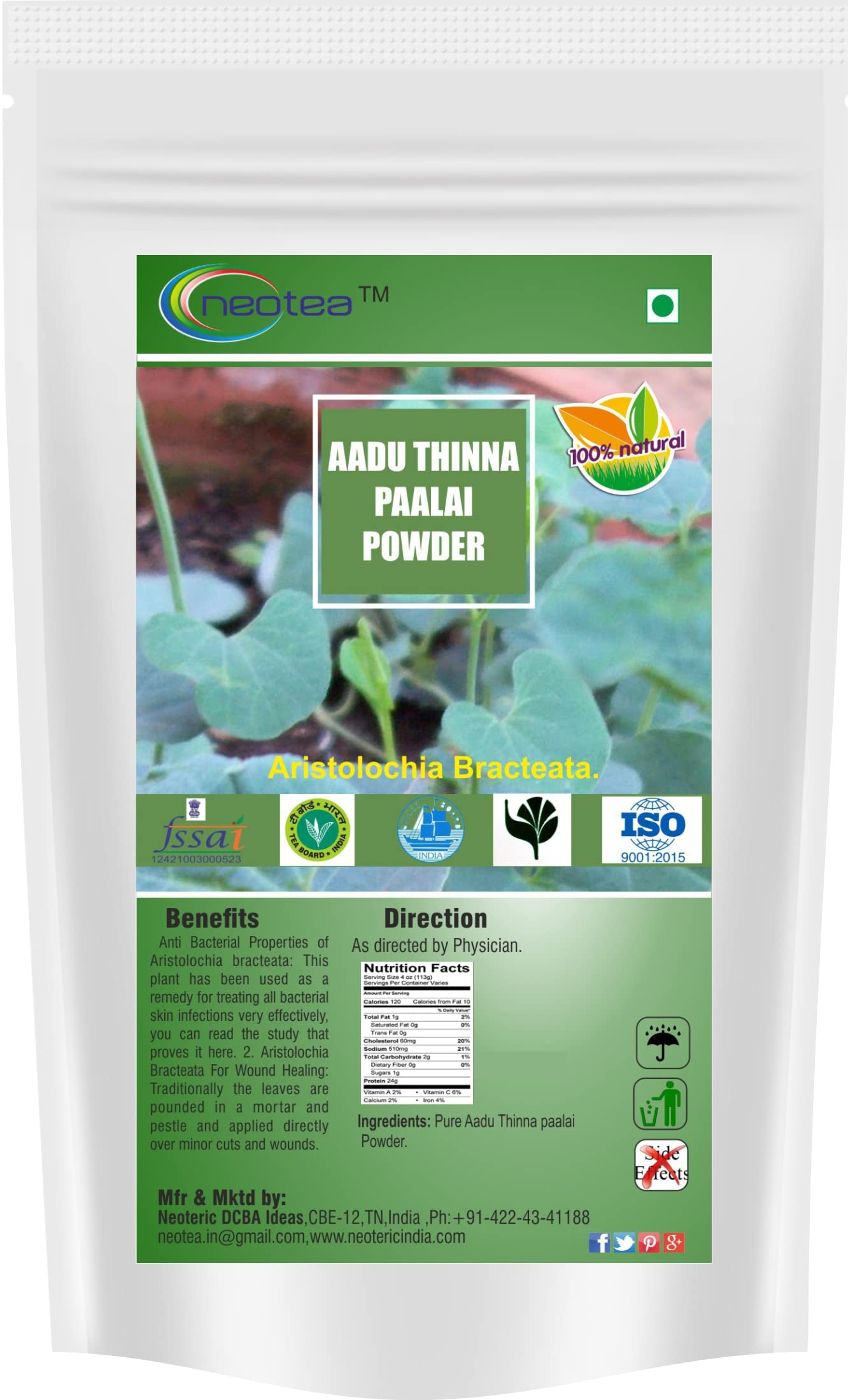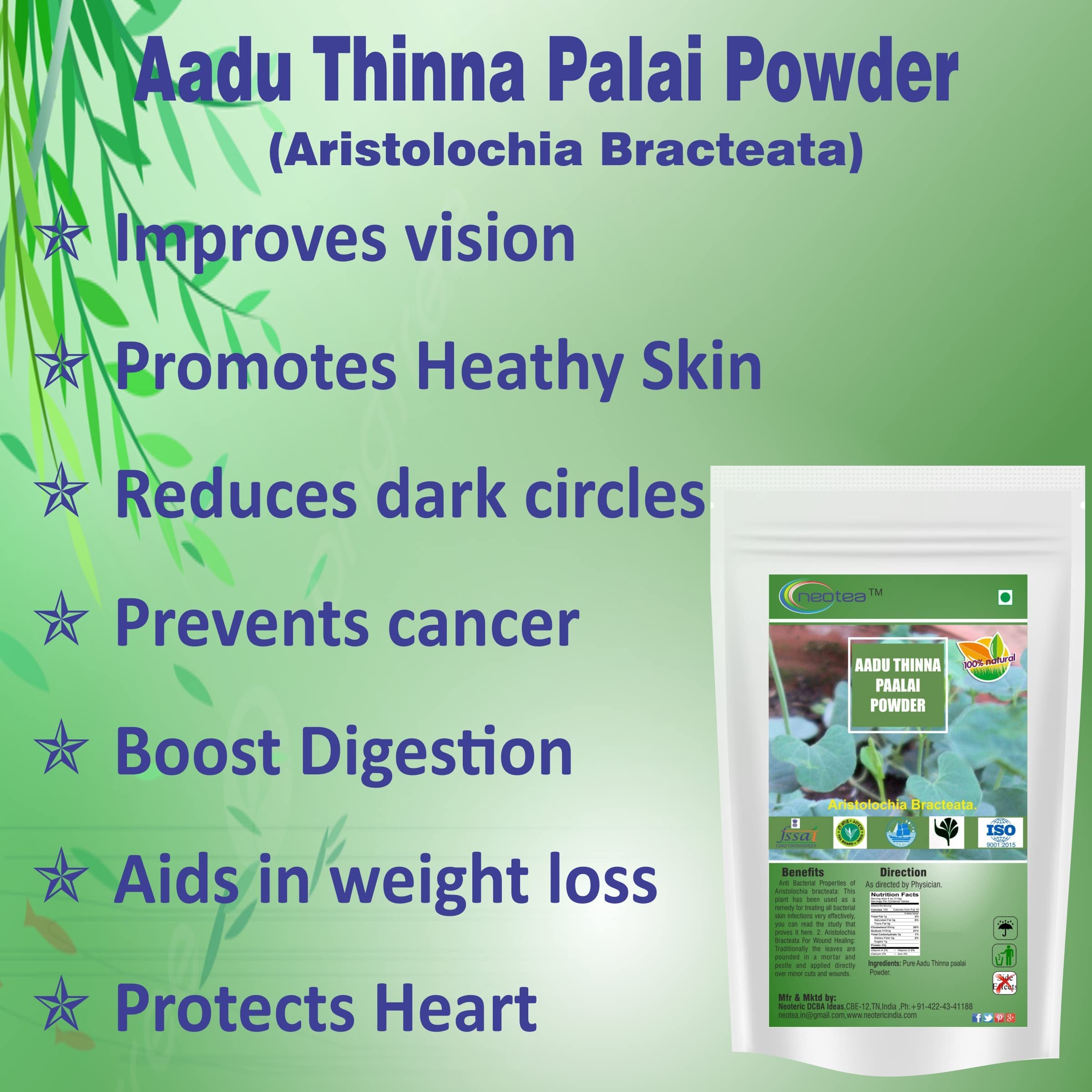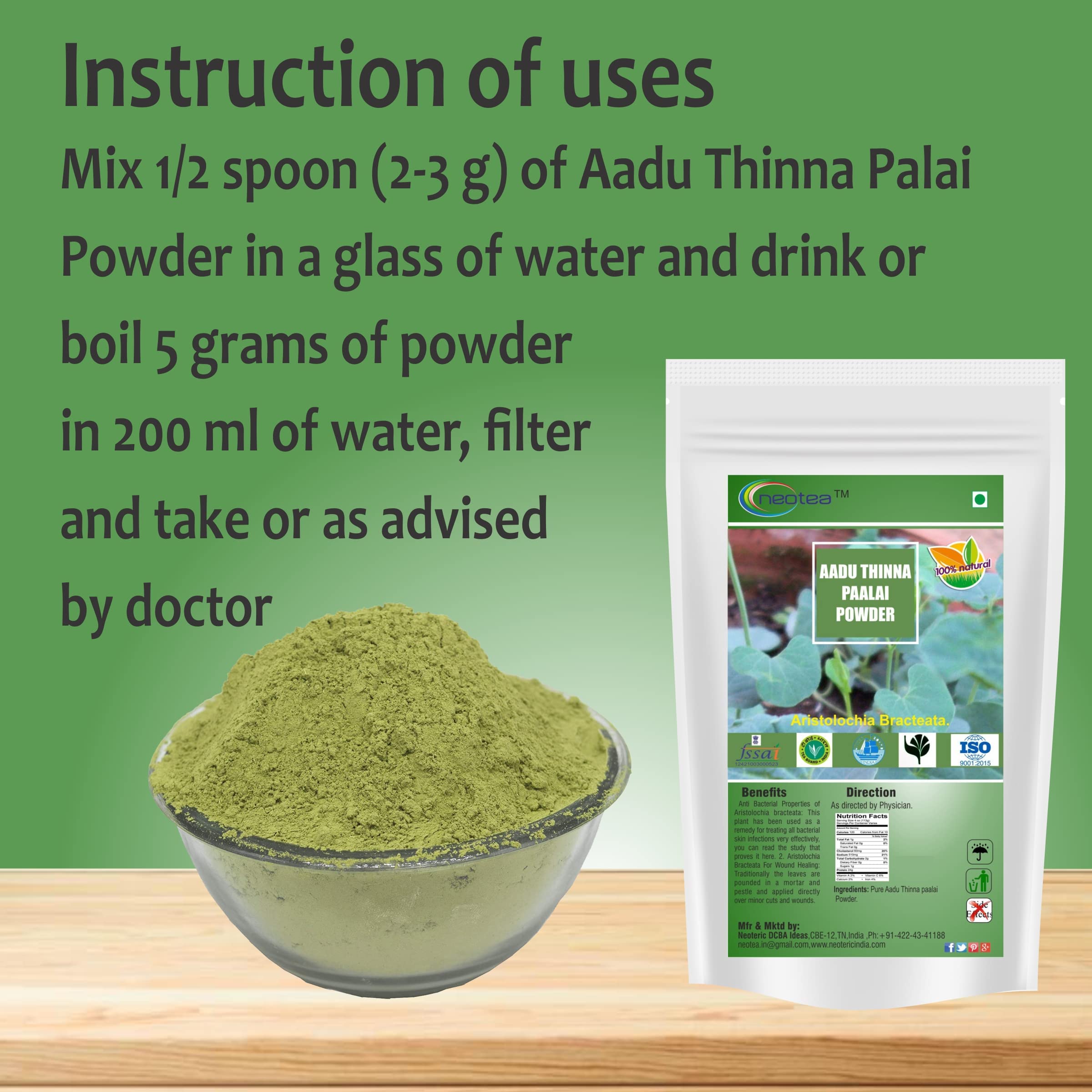 Experience the natural power of Neotea Aadu Thinna Paalai Powder (Aristolochia Bracteolata) carefully sourced to support skin health and wellness. Known as Indian Birthwort this traditional herb has long been used to address bacterial skin concerns helping promote clearer and healthier skin with its natural antibacterial properties. Each 300 GM pack is conveniently sized to provide lasting use making it easy to incorporate into your daily skin care routine. Neoteaâs powder is 100% pure with no added preservatives or artificial ingredients ensuring you receive only the best of natureâs remedies for a consistent and reliable approach to skin wellness.