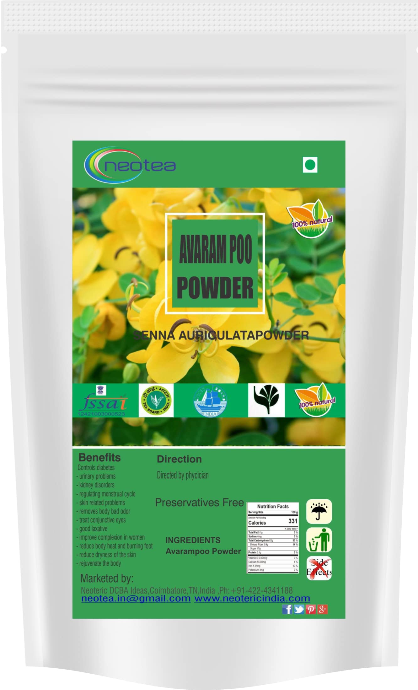 Neotea avarampoo powder | senna auriculata glowing skin. It had been used by indian women to enhance the glow of the skin to keep the skin even and to remove the black spots in the skin. Neotea a brand of health and household vitamins and dietary supplements. The products spectrum we offer to our customers includes Dry Fruit Herbal Powder Organic Cocoa Powder and many more.