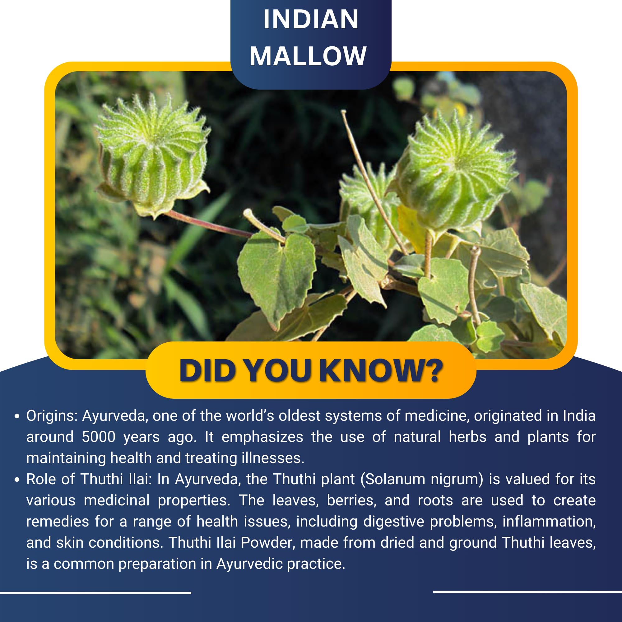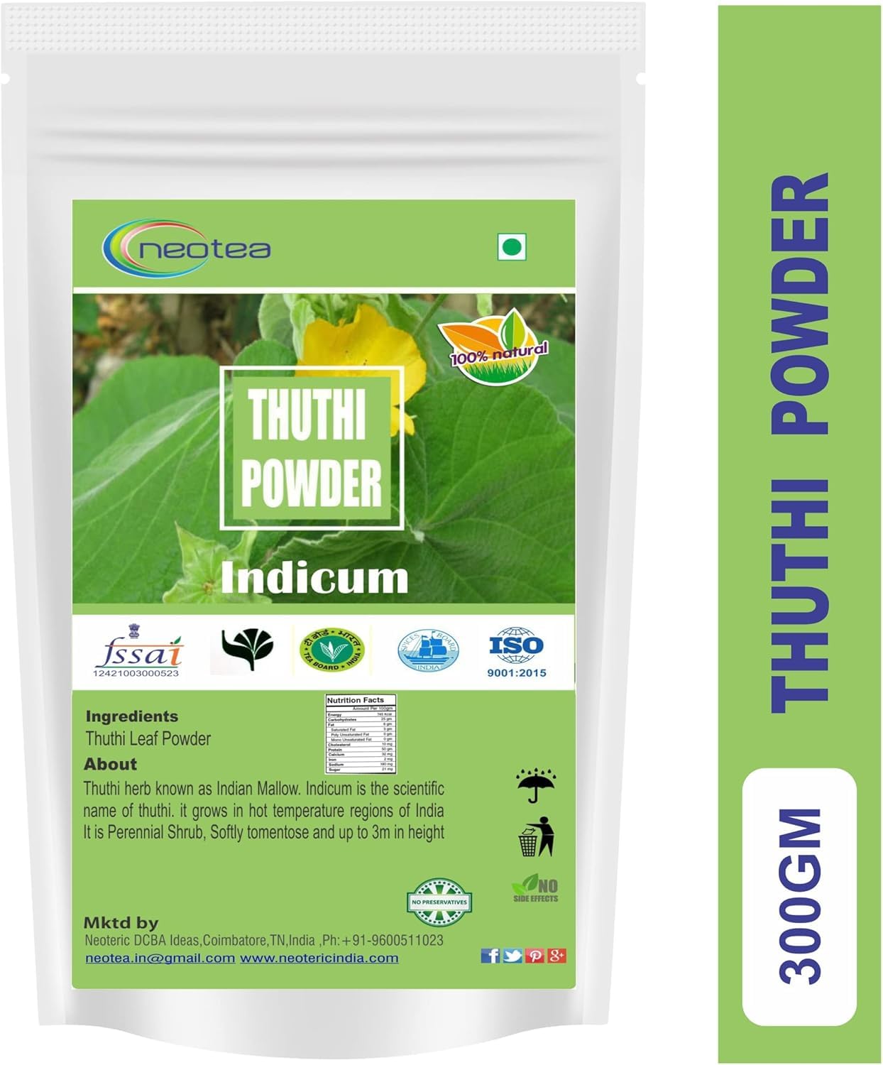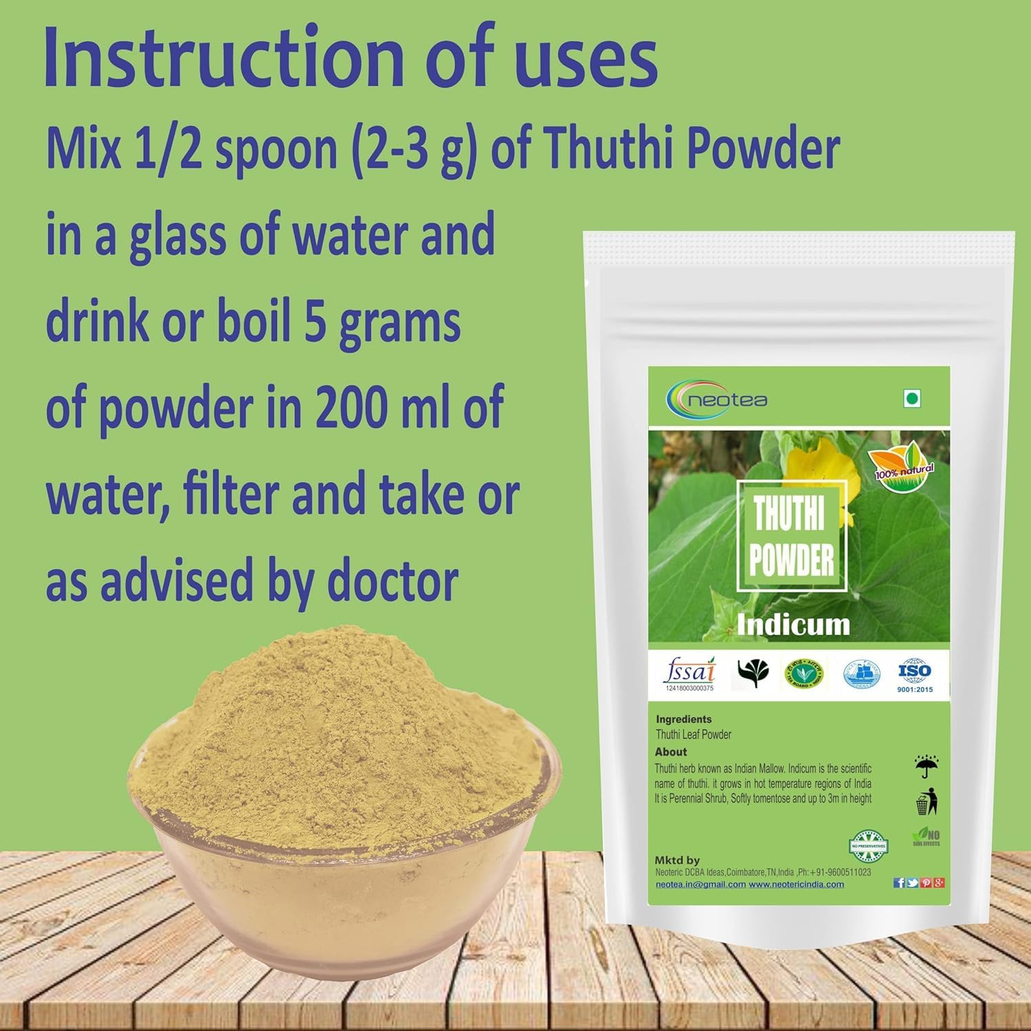 Neotea Thuthi or Abutilon Indicom Leaf Powder 300g our brand provides you with the products which are made from quality material. Providing quality standard products is our most priority for us. There are various collection of products available to choose from. Thuthi or Abutilon Indicom Leaf Powder It is useful in gout tuberculosis ulcers bleeding disorders and worms. It can be used as Digestive laxative expectorant diuretic astringent analgesic anti inflammatory anthelmintic demulcent and aphrodisiac. Decoction used in toothache and tender gums CONTENT. Abutilon indicum dried leaves in powder form. DOSAGE. 3 â 6 gm twice or thrice a day after food with warm water or as directed by the physician. THERAPEUTIC USES. Relieves constipation and treats piles. Heals wounds and boils. REFERENCE. Ayurvedic Sastric Medicine. Thuthi keerai and even its flowers is very good for ur problem. U can take without fear. Also try to take Karakarunai regularly in ur food. Avoid spicy foodsoily foodsChicken. Thuthi plant's botanical name is Abutilon Indicum and it's common English name is Indian mallow. Prepare a mixture of 50 ml each of carrot spinach and turnip leaves juice. Add some juice of bittergourd or karela leaves mixed with some buttermilk. This should be taken every morning. Turmeric has antiseptic and healing properties