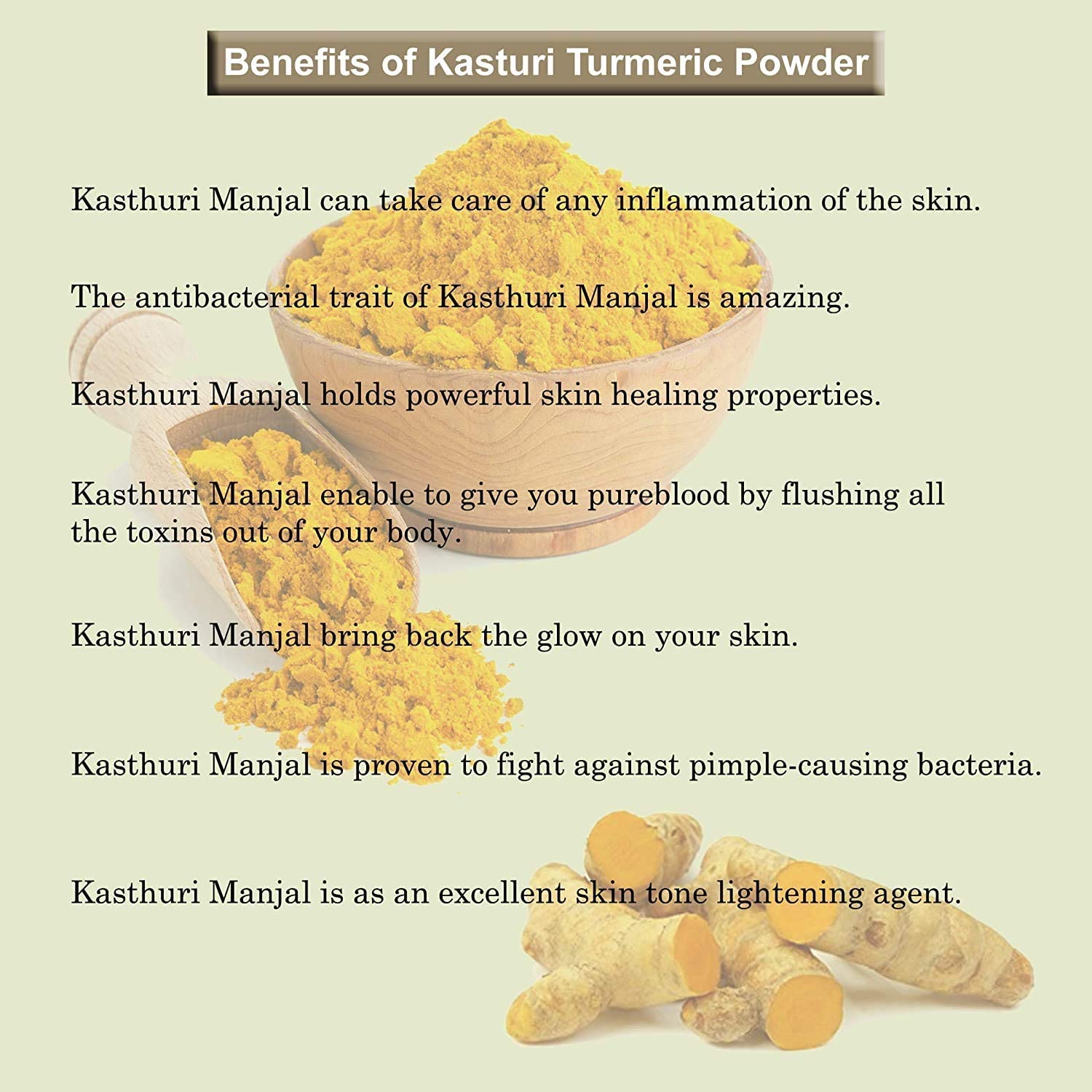 Kasturi Manjal and Sandalwood Powder For Skin Whitening | Wild Turmeric for Face Pack Skin Care.It possesses anti-inflammatory properties which are helpful in easing joint complaints namely arthritis osteoporosis and rheumatism. It arrests water loss from the body due to diarrhea and lose motions.Reduces acne;reduces pimcures ocular diseases;heals ulcer reduces stress and hypertension;relaxes nerves and muscles;prevents natural teeth loss