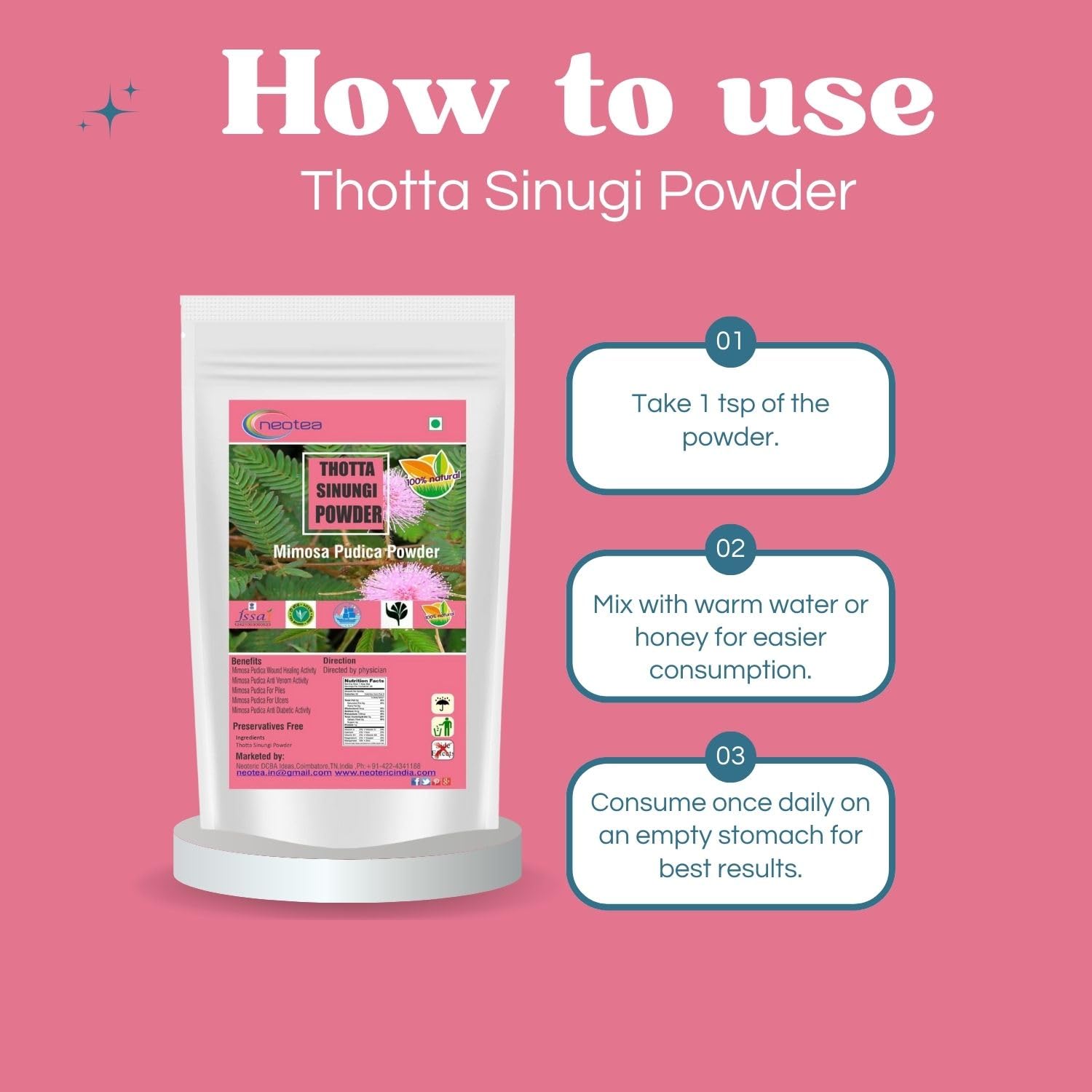 100% Natural & Organic: Neotea Thotta Sinungi Powder (Mimosa Pudica) is made from the purest natural ingredients free from additives preservatives or chemicals ensuring a high-quality herbal supplement.