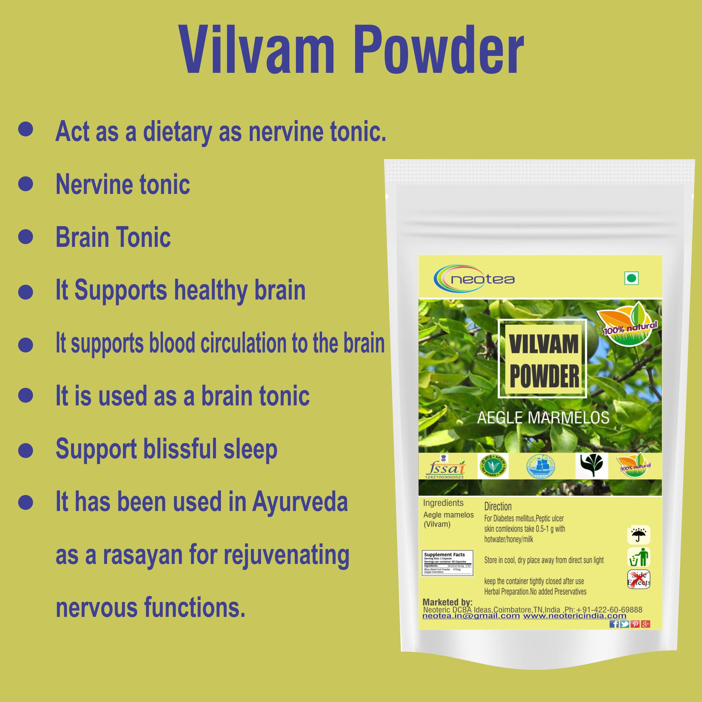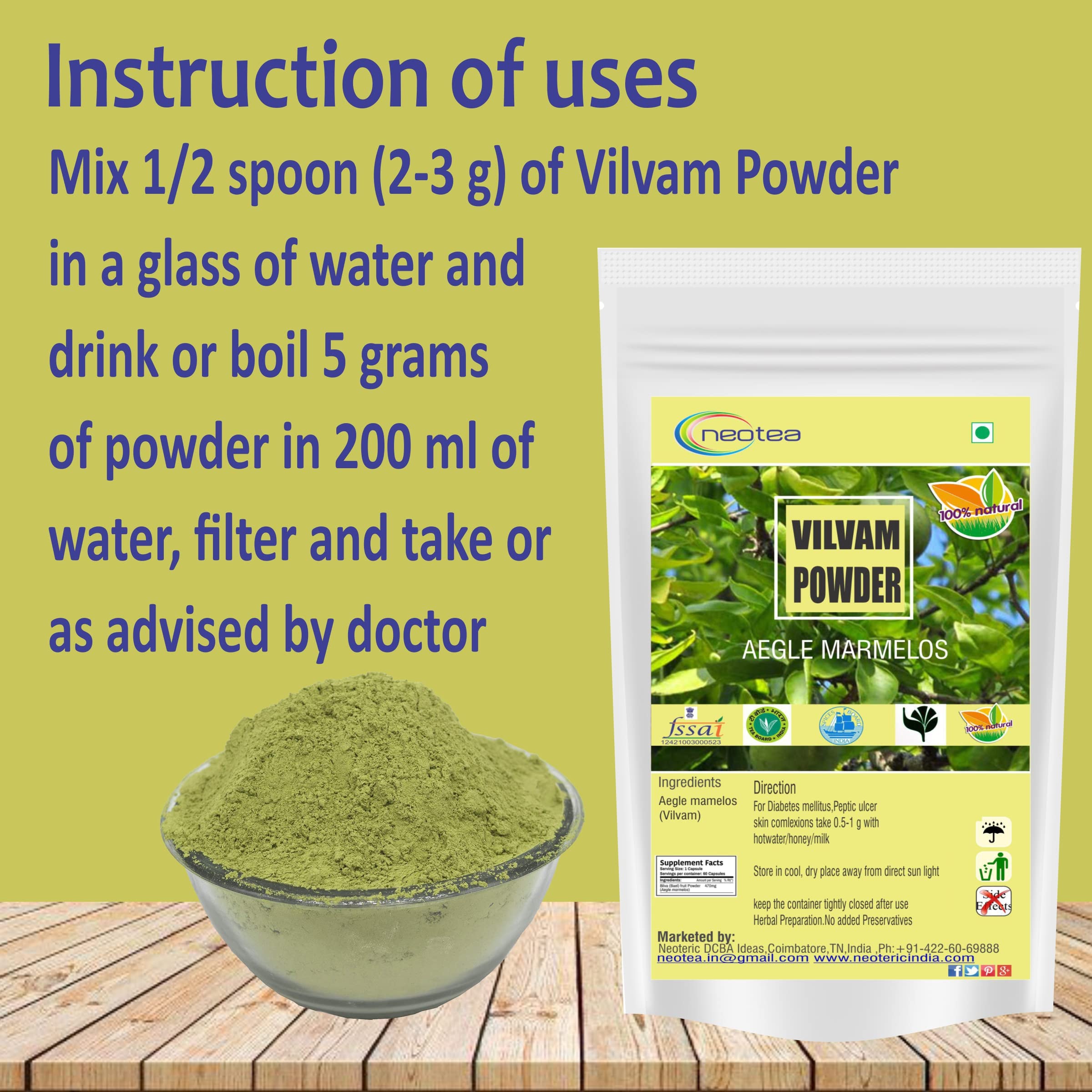 How to Use: Mix 1/2 spoon (2-3g) of Vilvam powder in a glass of water and drink preferably on an empty stomach for optimal benefits.