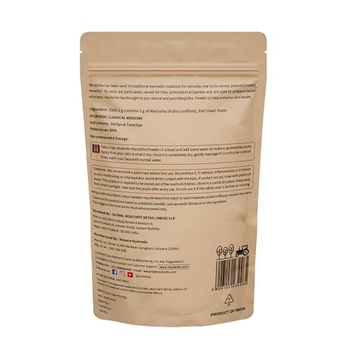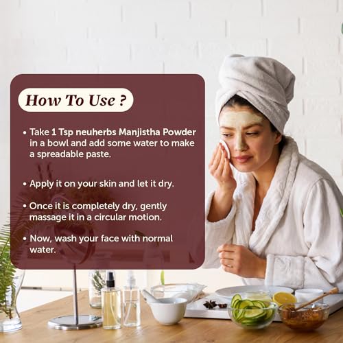 neuherbs brings to you natural and pure Manjistha powder which is derived from the dried roots of the manjistha scientifically known as Rubia Cordifolia plant and used for its skin-enhancing properties. It possesses anti-inflammatory properties that help reduce inflammation soothe irritated skin and reduce redness. It is also renowned for its ability to lighten the skin and even out the skin tone. Manjistha powder helps slow down the skin maturing process by promoting collagen production which gives our skin its elasticity and firmness. Manjistha root powder possesses antioxidant properties that help reduce skin blemishes detoxify the body promote healthy circulation and promote brighter complexion youthful radiant skin. neuherbs manjistha powder is cruelty & paraben free. It does not contain any artificial colour or additives. When applied on the face manjistha powder helps promote a bright complexion & a clearer skin.