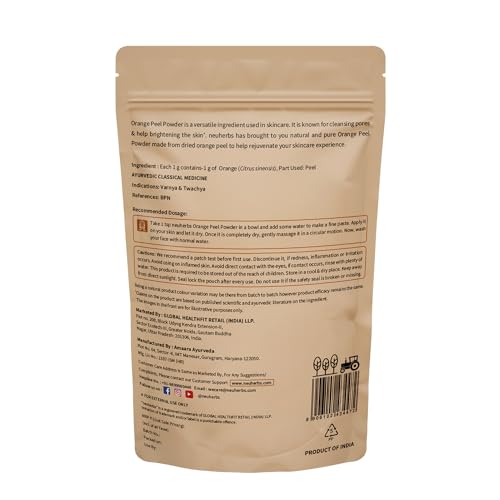 The neuherbs Orange peel powder uses the power of citrus to achieve a radiant and glowing skin. The powder is made by finely grounding the orange peels and when used in a face mask uses its natural astringent properties to help tighten the pores and control excess oil. Orange peels act as a brightening agent which helps in fading dark spots and evening skin tone. Its gentle and natural exfoliating properties help remove dead skin cells and achieve a more smoother skin surface. When incorporated into drinks or beverages orange peel powder can provide an added advantage by promoting healthy collagen production and potentially reducing the appearance of wrinkles. By including the neuherbs Orange peel powder in your beauty regimen you can go down a natural path of achieving a healthy and glowing skin. neuherbs orange peel powder is cruelty & paraben free. It does not contain any artificial colour or additives.
