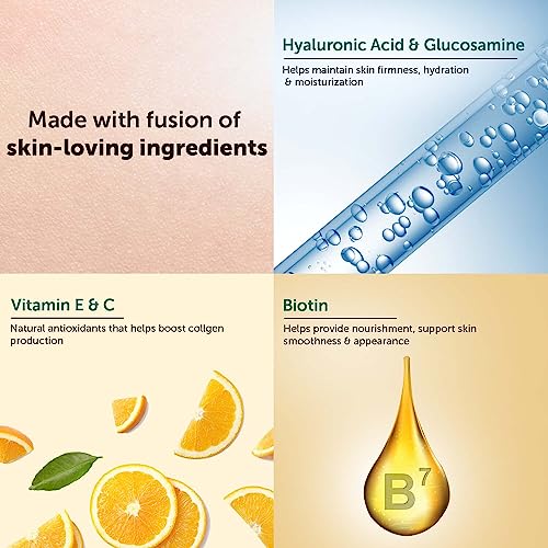 • Collagen Peptide For Skin- With 5g of type 1 hydrolyzed marine collagen peptides & glucosamine which helps replenish lost collagen to support wrinkle free elastic & youthful skin.