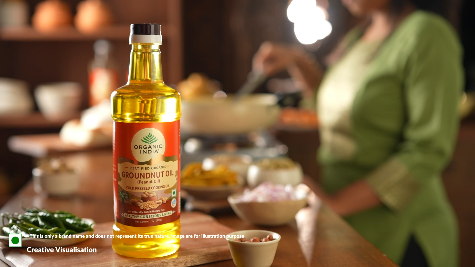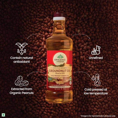 ORGANIC INDIA Groundnut OIl (Peanut Oil) Groundnut Oil (peanut oil) naturally contains antioxidants Vit A and E as well as monounsaturated fatty acids (PUFA) which help in lowering cholesterol. One of the healthiest cooking oils it has a high smoke point which makes it perfect for frying and cooking at high temperatures without burning. This is expeller pressed double filtered and healthier than refined version of the same oils.