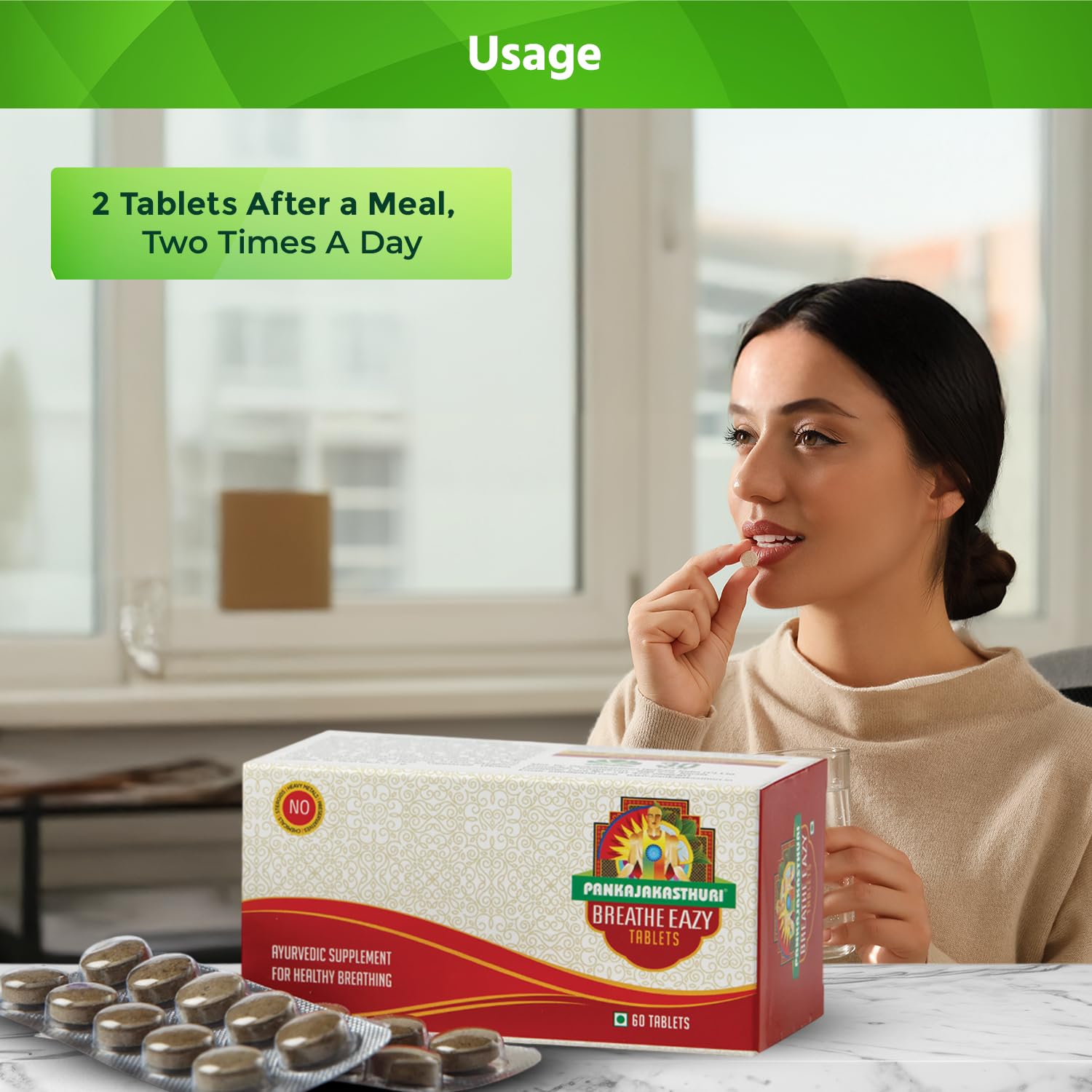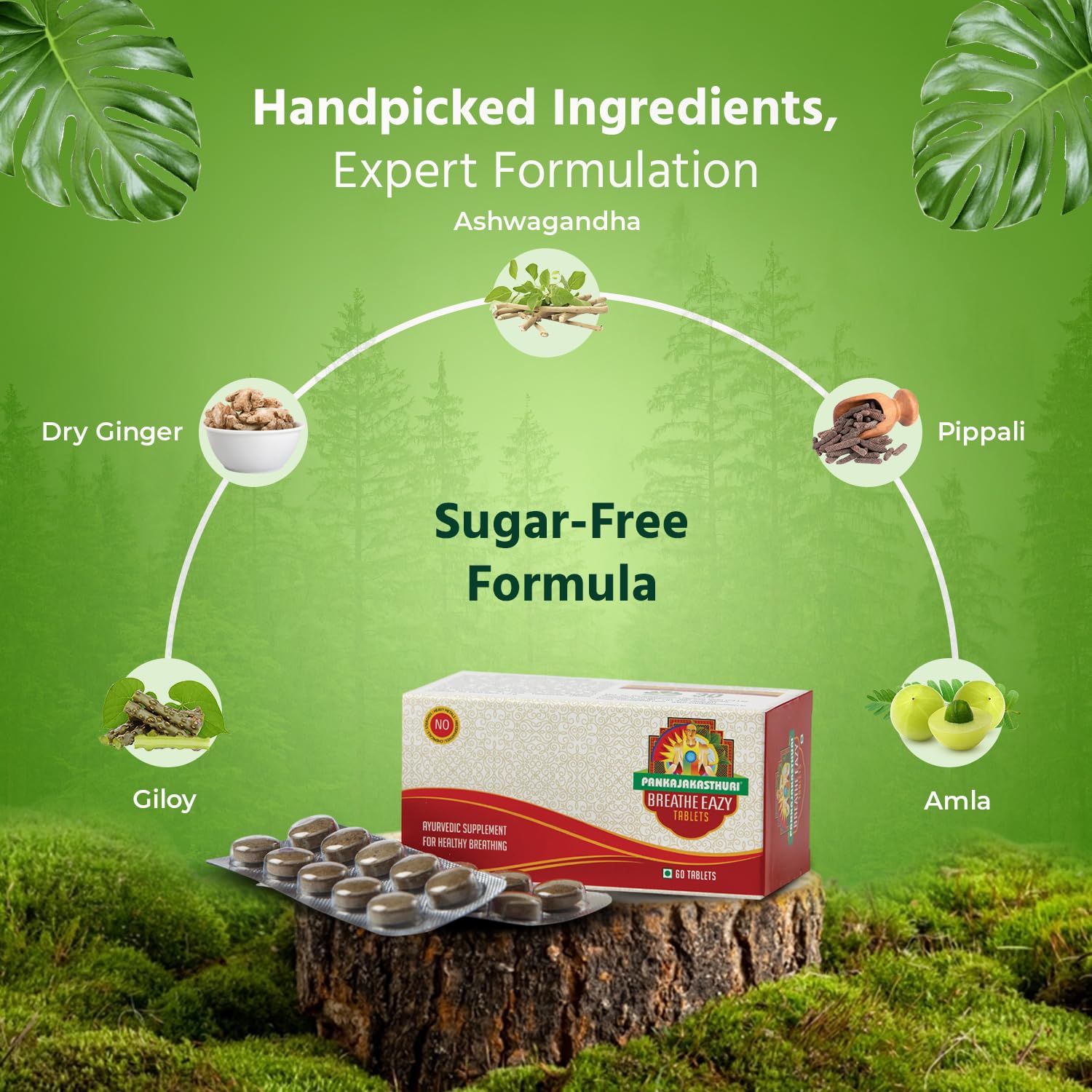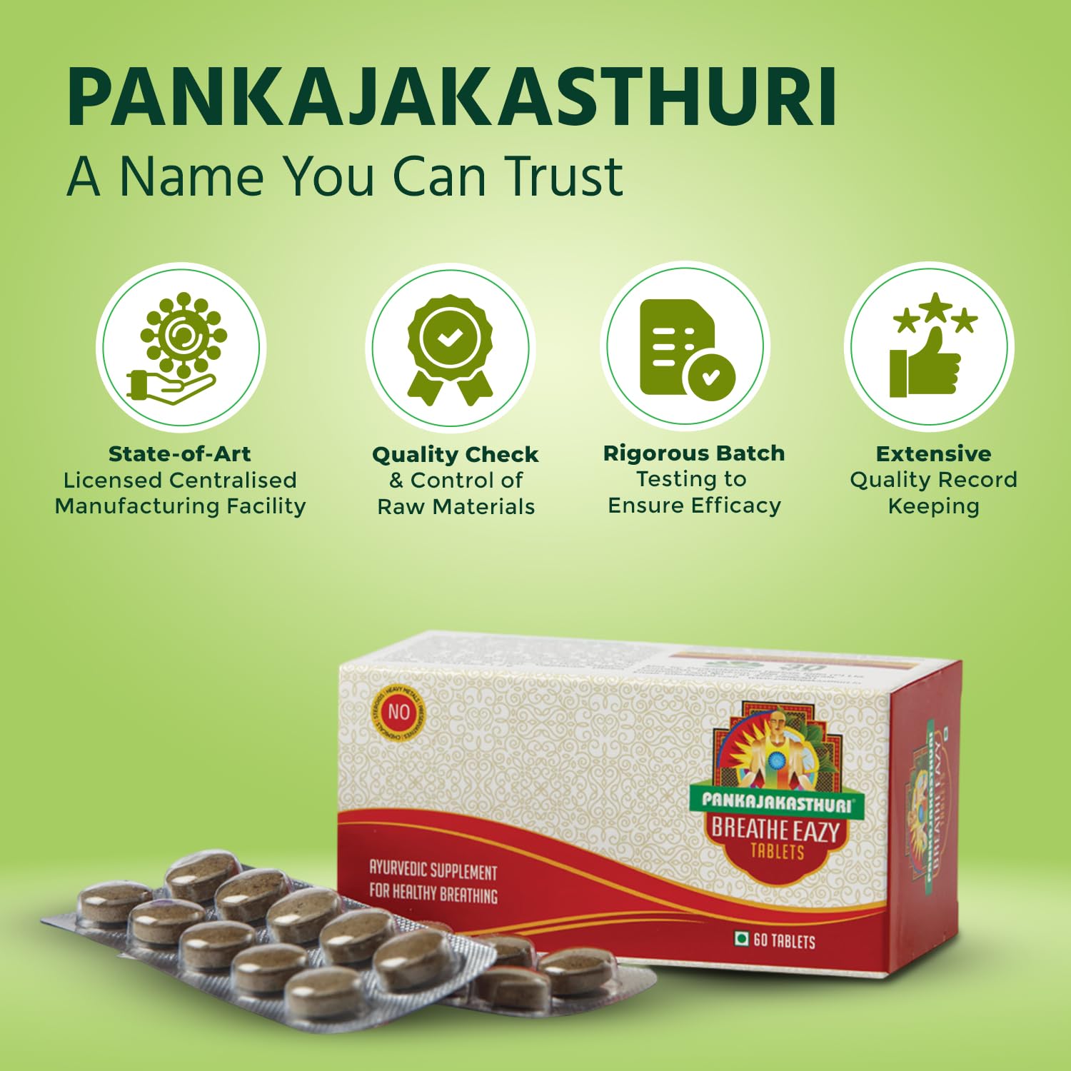 Pankajakasthuri Breathe Eazy Tablet Ayurvedic For Cough & Cold Sinus Asthma Bronchitis & Breathing Disorders | Natural Immunity Booster | Unique Blend of 17 Ayurvedic Herbs - 60 Tabs