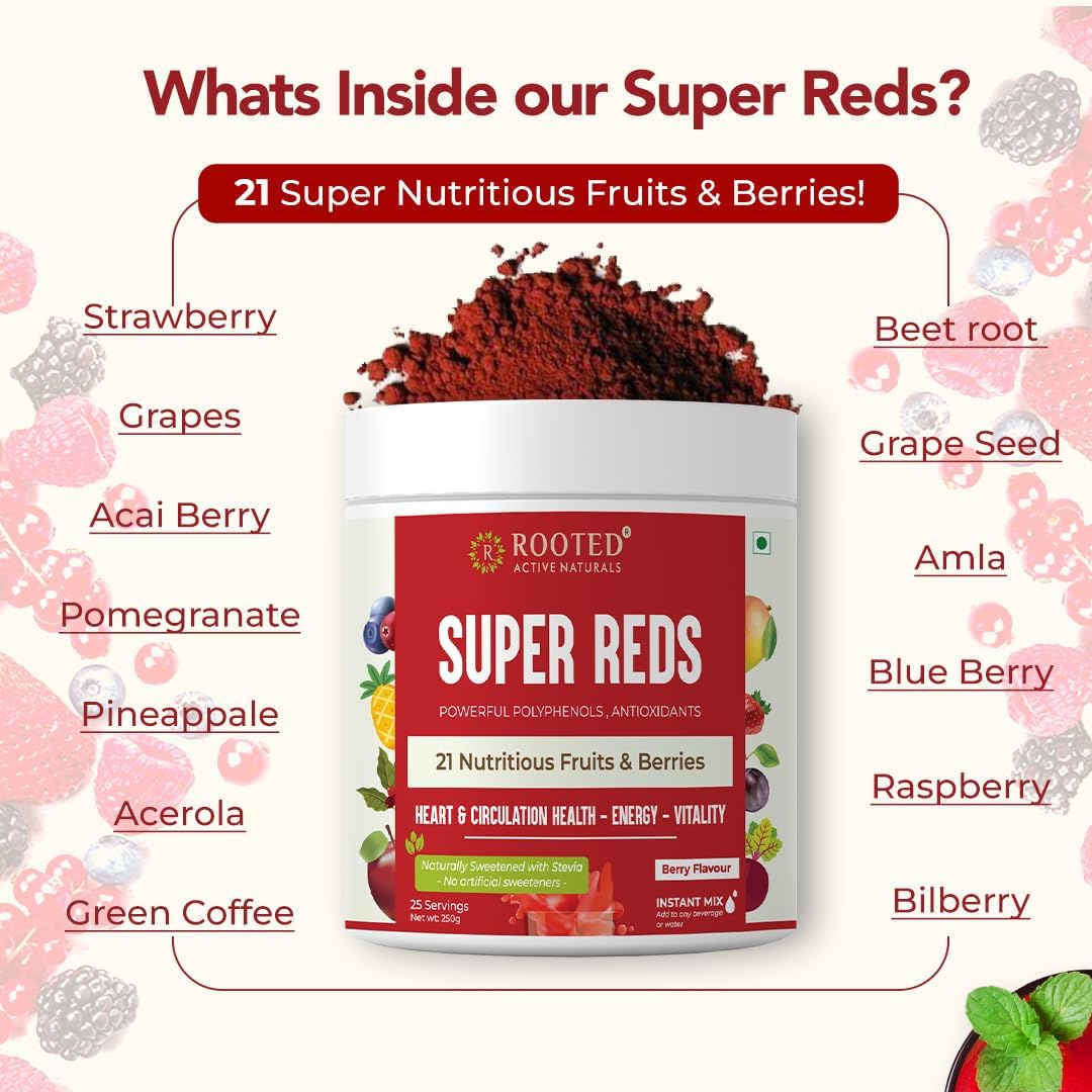 Rooted Actives Super Reds Powder (Pack of 4 250g each) is made from a carefully selected fruit and berry blend including grapes raspberries beetroot strawberries and pomegranate. This powder has no added sugar and contains no artificial flavors sweeteners or preservatives. Designed for easy mixing this berry-flavored formula blends well with water smoothies or juices. It is vegan non-GMO and gluten-free making it a suitable choice for various dietary needs. The pack of 4 offers long-term value.
