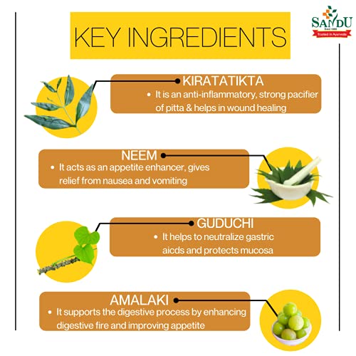 Bhunimba is an anti-inflammatory strong pacifier of pitta & helps in wound healing. Acts synergistically enhances effects of other ingredients. Parpat reduces burning sensation and loss of appetite. It relieves hyperacidity by neutralizing excessive gastr