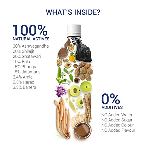 MADE WITH POTENT INGREDIENTS: This juice is made with potent ingredients - Shilajit Ashwagandha Bhringraj Jatamansi Triphala and Shatavari. Together these ingredients help improve your vitality and stamina and boost your immunity. They also help reduce st