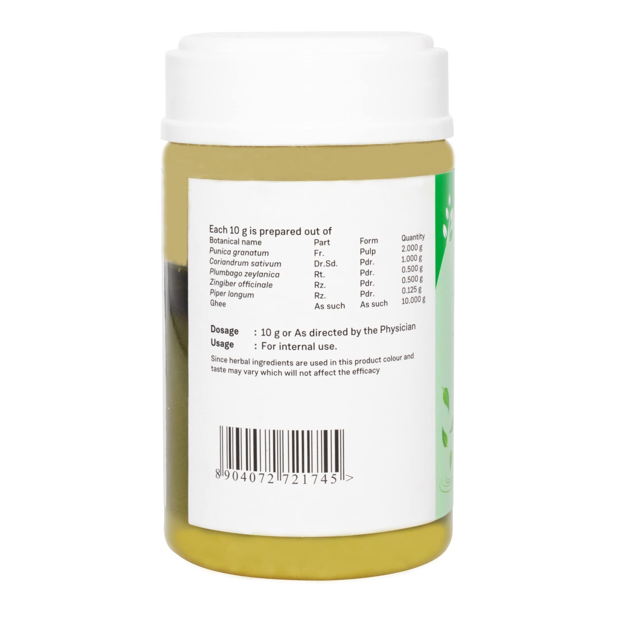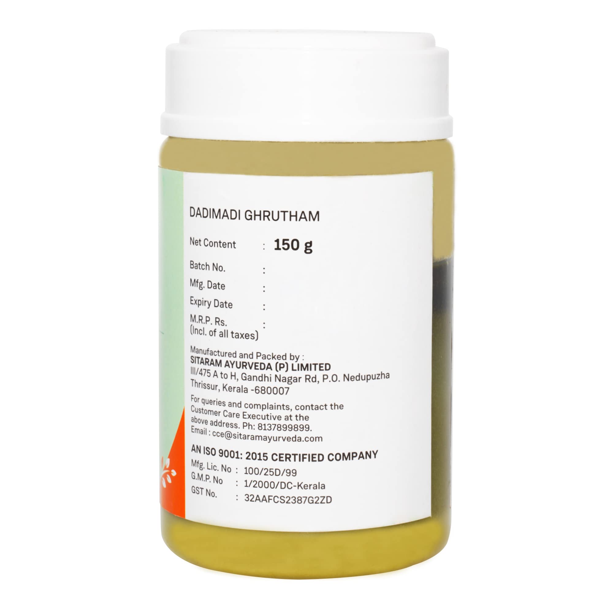 Dadima is the Sanskrit word for pomegranate. Dadimadi ghritham is a medicated ghee known for its excellent action. Its reference particularly mentions Mooddha vata anulomana as its function i.e it releases vata that is obstructed in the and restores its functions like absorption and excretion. Sluggishness of kapha along with the erratic behavior of vata results in absorptive ailments and deficiency. It is safely recommended for use in women for maintaining .