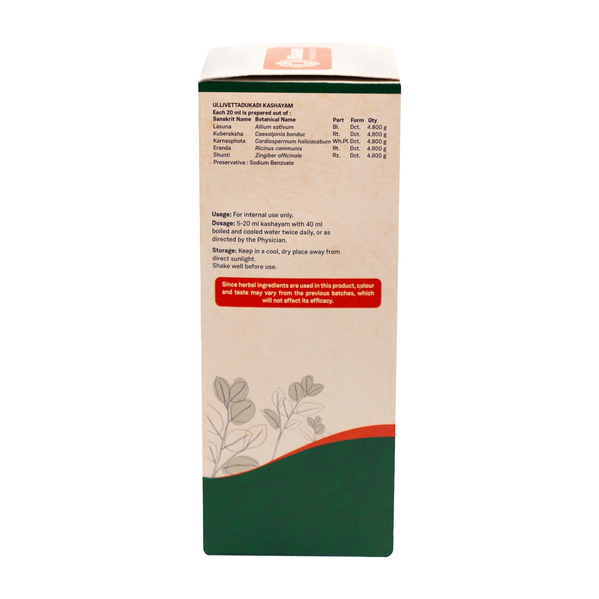 Ullivettudukadi is a traditional formula mentioned in the context of management of abcesses abnormal tissue growth. It is seen to have specific action in the pelvic and groin region. Kashaya or herbal decoctions harness the healing properties of herbs and roots in a mild and easily absorbable water base.