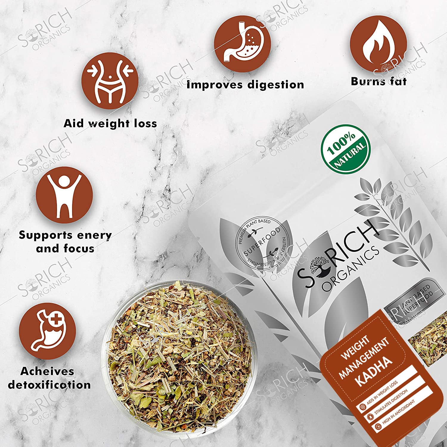 Weight loss Kahda by Sorich Organics is one of the most charismatic ways to get fit inside out without having to put in any rigorous efforts. This is a reliable and highly beneficial Kahda that will give you the desired results whilst you follow your Diet. Weight loss kahda has been formulated by using a melange of ingredients like Green Coffee beans Green Tea Lemon Grass Ginger Cinnamon Licorice and Garcinia Cambogia healthily accelerate your weight loss. It brims with antioxidants that are of utmost help in improving digestion bowel movements and aid in overall fat depletion. Losing weight is equivalent to annihilating a large number of ailments as well. With all the key advantages in mind the miraculous Weight Loss Kahda is just the right step towards your weight-loss journey.