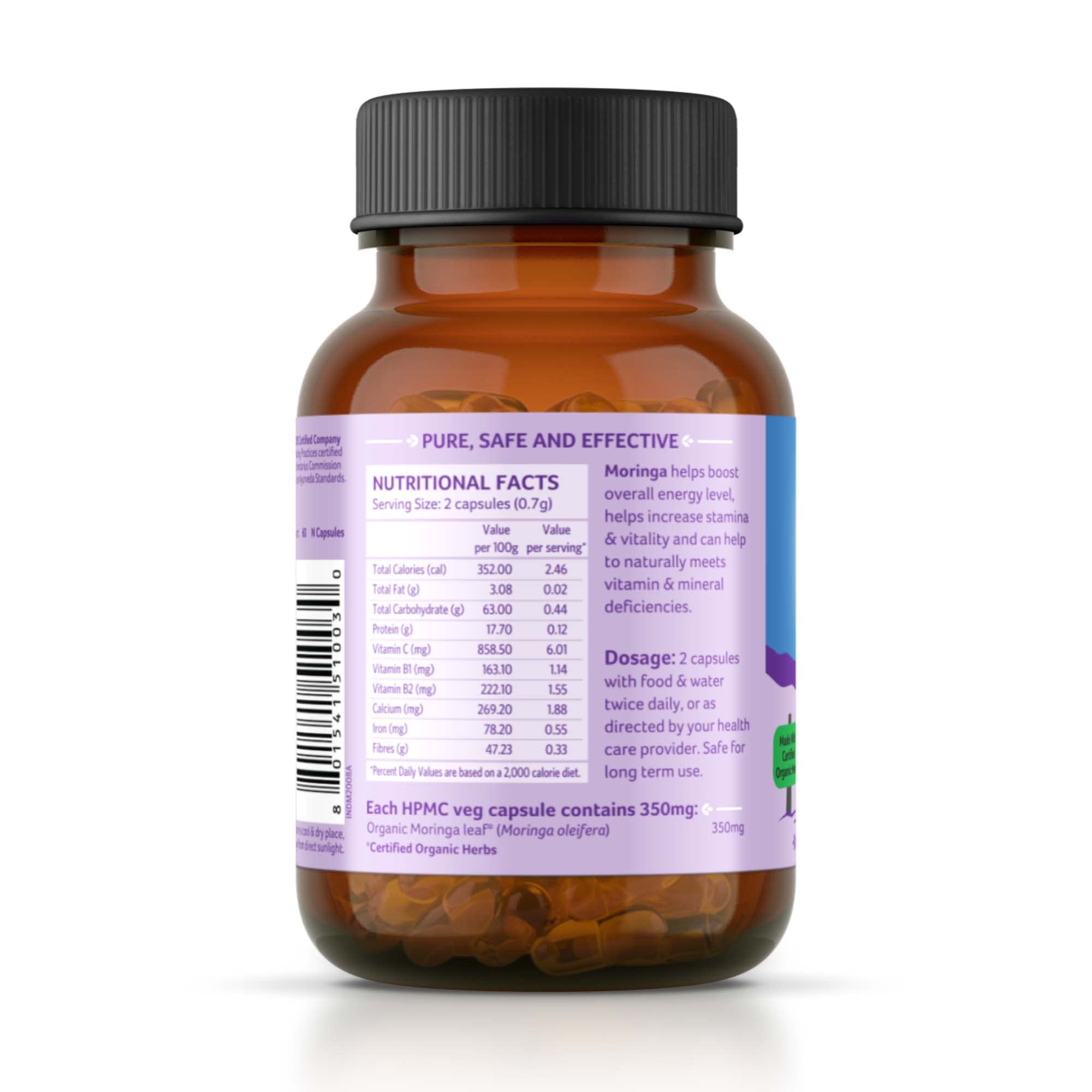 Organic moringa capsule contains organic leaf powder of moringa oliefera (Sahjan)The powder is produced by harvesting drying then milling the leaves of moringa oleiferaThe powder is extremely rich in nutrientsIt contains 90+ nutrients and 40+ antioxidantsIt is an excellent source of vitamin a vitamin c iron protein fibre calcium magnesium and potassium