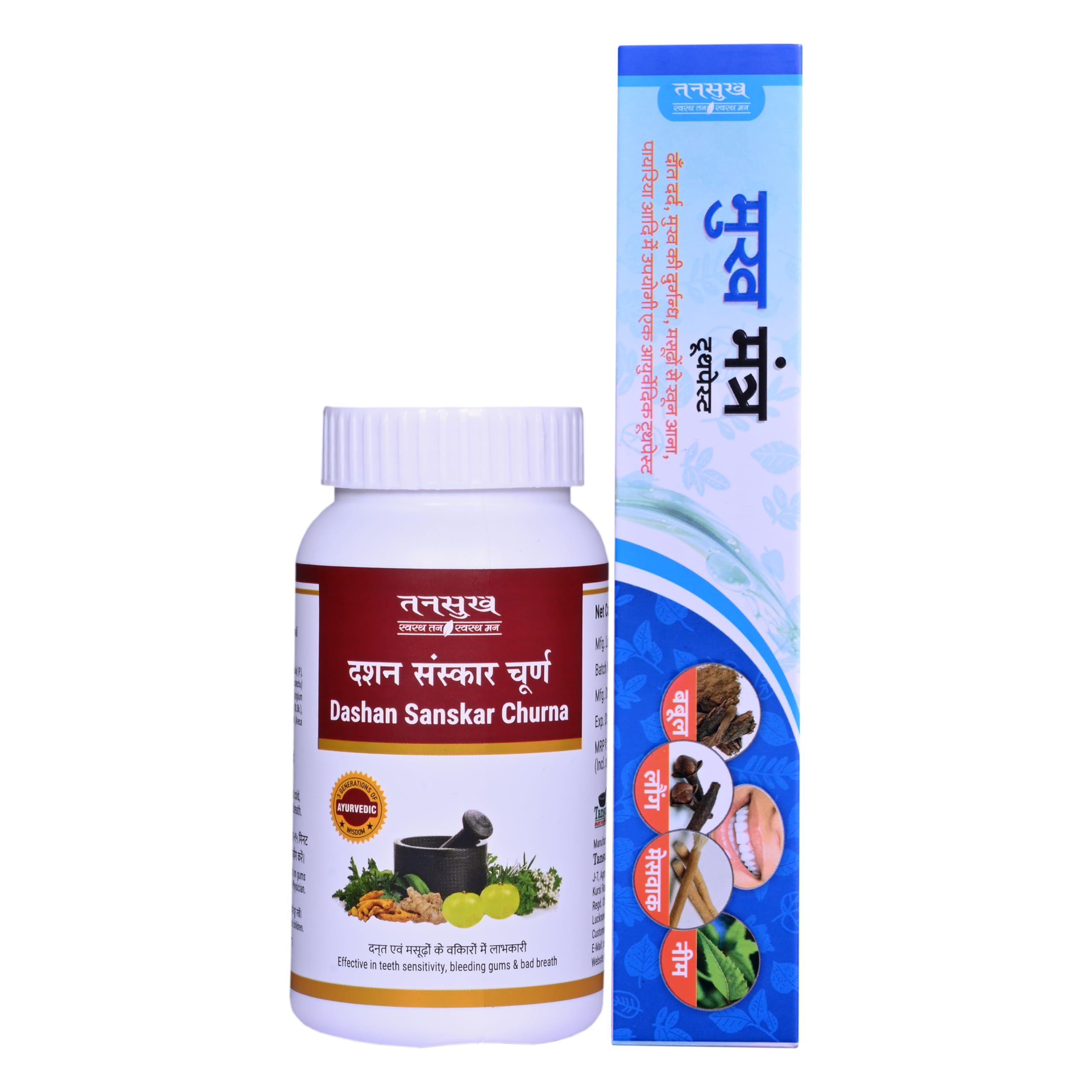 This oral care combo from Tansukh includes Dashan Sanskar Churan and Mukh Mantra Toothpaste crafted with Ayurvedic ingredients to support healthy gums and teeth. The churan is a traditional herbal powder for dental care while the toothpaste offers a convenient daily-use option. Together they help promote oral hygiene freshness and overall dental wellness. A holistic choice for your everyday oral care routine.