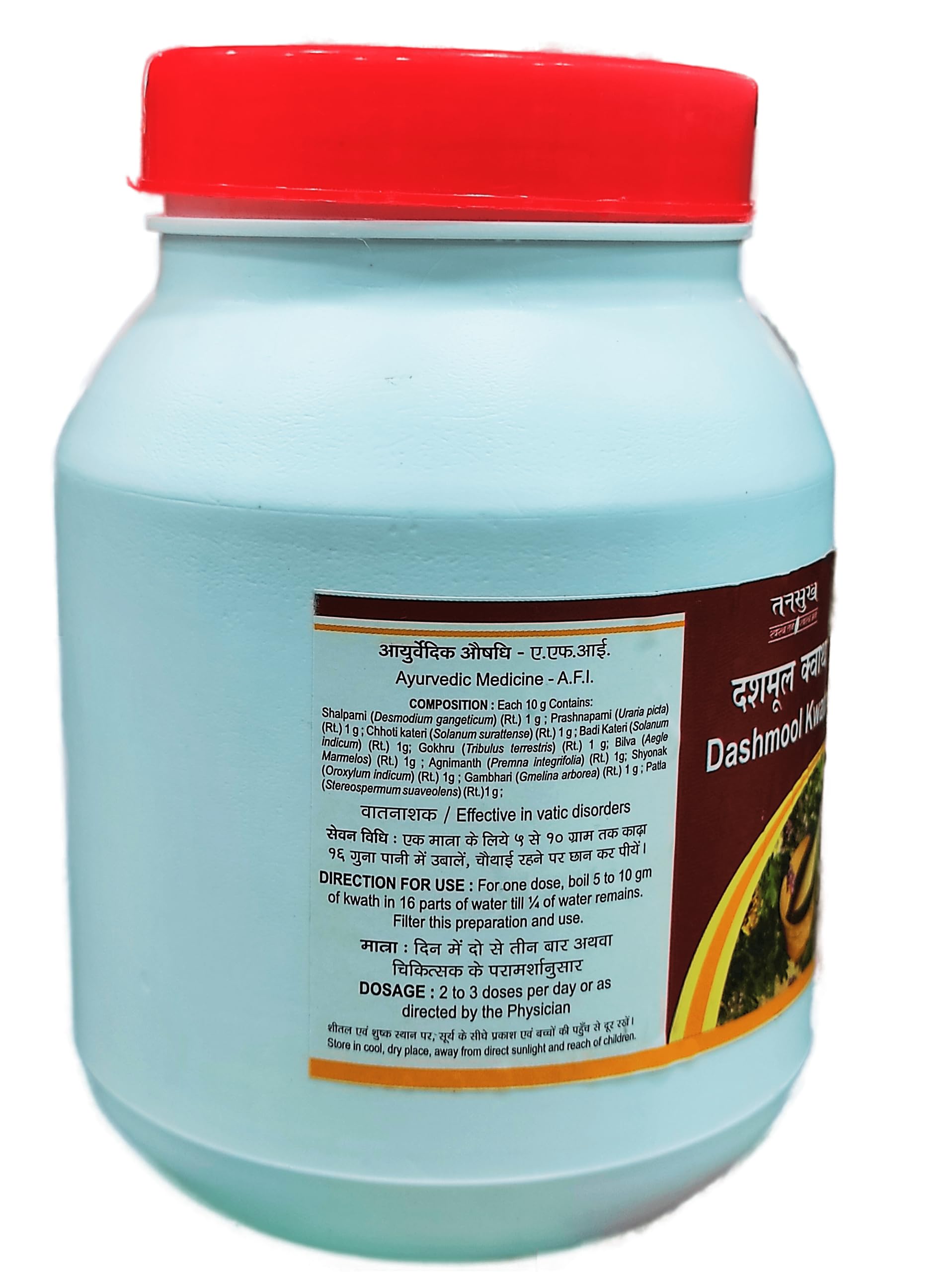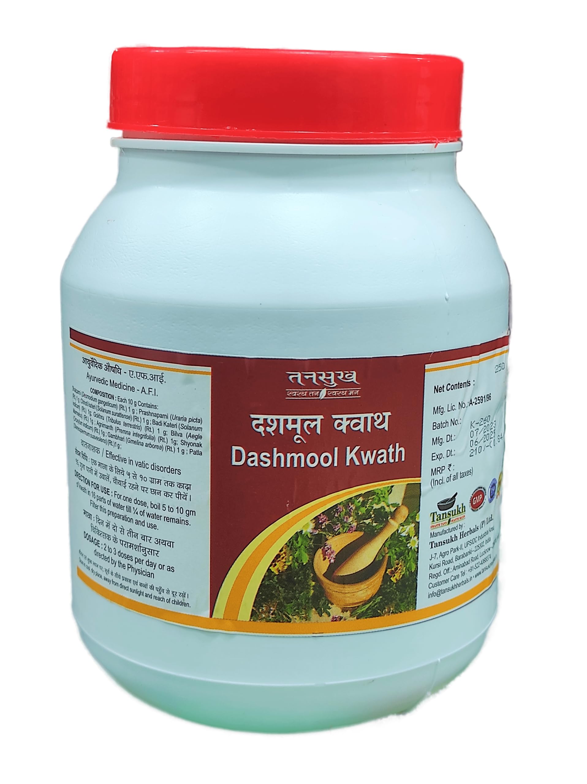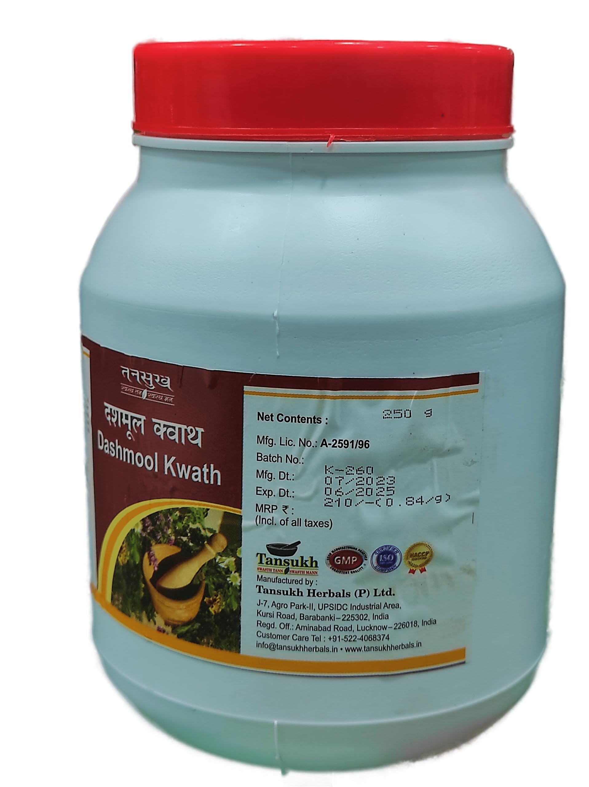 Tansukh Dashmool kwath or Dashmool Kadha is an ayurvedic formulation and contains Shalparni Chhoti Kateri Badi Kateri Gokharu Agnimanth Bilwa gambhari Patla Shyonak.