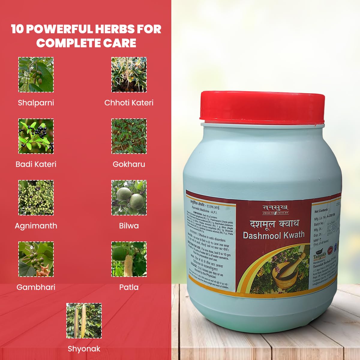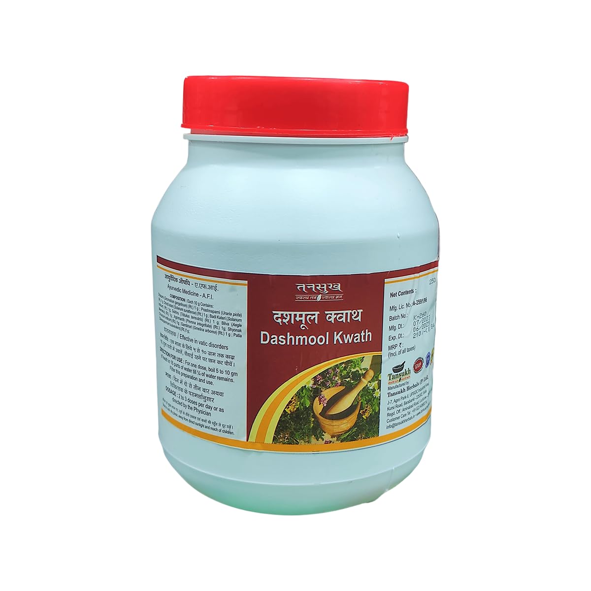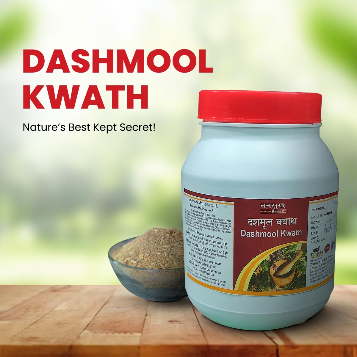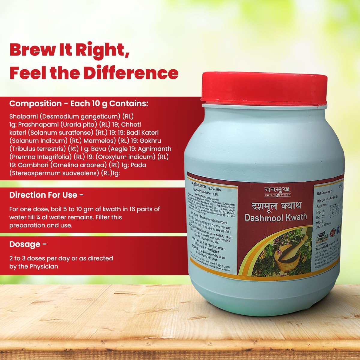 Tansukh Dashmool kwath or Dashmool Kadha is an ayurvedic formulation and contains Shalparni Chhoti Kateri Badi Kateri Gokharu Agnimanth Bilwa gambhari Patla Shyonak.