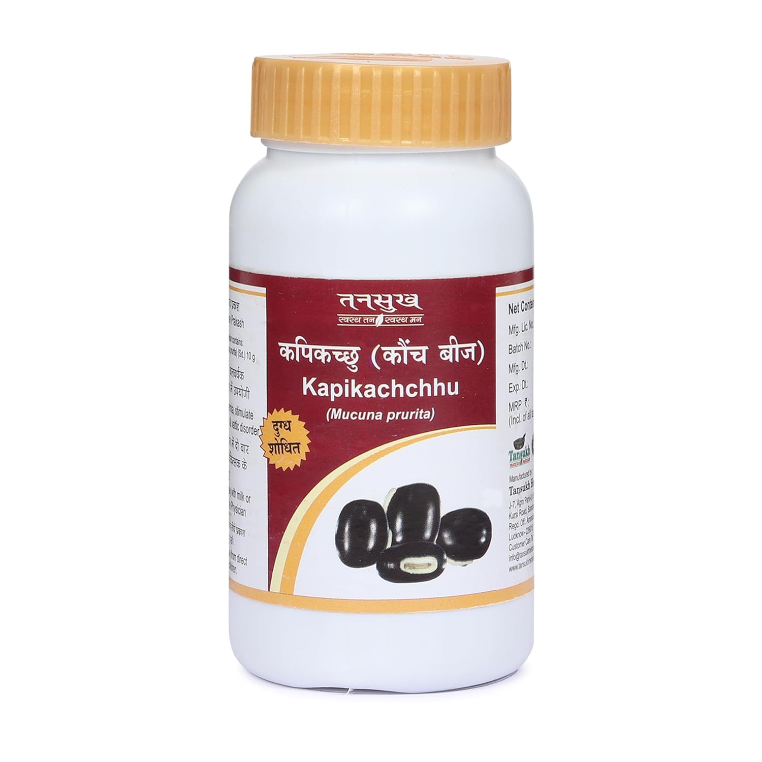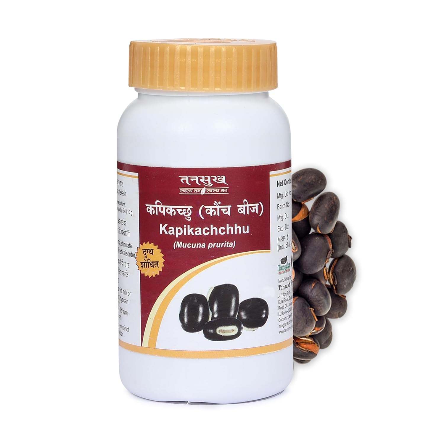 Tansukh Kapikachchhu (Black Kaunch Beej) Churan comes in a convenient pack of offering a potent blend of Mucuna Pruriens (also known as Velvet Beans Kauch or Kapikachhu). This ayurvedic powder is traditionally used to support stamina and vitality making it popular for those involved in physical activities or body building. It is believed to help enhance energy levels and strength. The powder is also thought to support mental focus by promoting concentration and clarity while helping to reduce stress. Tansukh Kapikachchhu Powder may also contribute to skin health by aiding in the reduction of pimples acne and dark spots promoting a clearer complexion. Additionally it contains essential amino acids which are beneficial in managing dandruff and preventing hair fall. Made from pure ayurvedic ingredients Tansukh Kapikachchhu Powder is free from additives. It is easy to incorporate into your routineâsimply mix with honey or warm milk and consume twice daily after meals. The powder comes in a resealable pouch ensuring convenience and freshness. Ideal for daily use it supports overall wellness and promotes a balanced lifestyle with consistent use.