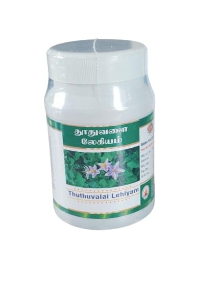 Experience the ancient healing power of Vadalur Arutjothi Vaidyasalai Thoothuvalai Lehyam a traditional Siddha remedy trusted for generations to combat cold and its bothersome symptoms. Say goodbye to sneezing congestion and discomfort with this natural herbal formulation. Key Features: 1. Siddha Excellence: Thoothuvalai Lehyam is crafted following time-honored SIDDHA principles. It is a blend of potent herbs primarily Thuthuvalai (Solanum trilobatum) well-known for its anti-inflammatory and respiratory benefits. 2. Cold Symptom Relief: If you're tired of relying on over-the-counter cold medicines with potential side effects Thuthuvalai Lehyam offers a gentler alternative. It soothes sore throats eases congestion and alleviates coughing making it your go-to remedy for cold and flu season. 3. Natural Ingredients: This herbal lehyam is free from synthetic additives. It contains only natural ingredients carefully choosen for their effectiveness in promoting respiratory health. 4. Easy to Consume: Thoothuvalai Lehyam is available in a convenient easy-to-use form. Simply take 5gms twice or thrice in a day and you'll experience the benefits in no time. 5. Immune System Support: In addition to relieving cold symptoms Thoothuvalai Lehyam can also help bolster your immune system reducing your chances of falling sick in the first place. 6. Safe for All Ages: This herbal remedy is safe for children and adults making it a versatile addition to your family's wellness arsenal. Don't let cold and flu symptoms keep you down. Trust in the ancient wisdom of Siddha and Thoothuvalai Lehyam to provide natural relief. Make it a part of your holistic wellness routine today. Experience the power of traditional Siddha by adding Thuthuvalai Lehyam to your cart now. Your journey to natural healing begins here!