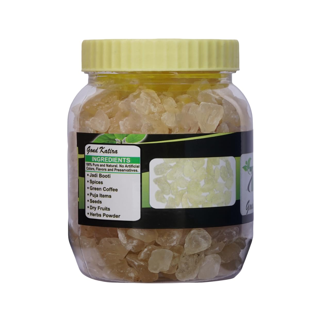 TRH Gond Katira Pure (Edible Gum) | Tragacanth Gum | High Cooling Properties Herbal Food | Super Food | Gond/Gund/Gound || Gond katira is 100% pure and natural. Only high-quality hand-sorted gond katira peices go into the packet. Gond Katira is a natural cooling agent and relieves the body heat. It is used in preparing summer drinks such as smoothies. Due to its cooling and hydrating properties it helps in making skin glowing. It also combats constipation because of its purgative properties. It is often used as an ingredient in Ayurvedic formulations. This versatile gum can be utilized in various ways. It can be added to beverages desserts or even skincare products to enhance their benefits. Gond Katira also known as tragacanth gum is a natural edible gum that comes from the sap of the Astragalus plant. It has many uses including: -Cooling Gond Katira absorbs water to form a gel that can help with dehydration and heat stroke. -Thickening It can be used as a natural thickener in desserts puddings and ice cream. -Traditional medicine It's used in traditional medicine and Ayurveda for various health benefits. -Culinary It can be used in sweets vegetable curries drinks condiments salad dressings sauces and mayonnaise. -Emulsifying It can be used for emulsifying and stabilizing purposes. Gond Katira is a vegetarian product that's high in protein calcium and magnesium. It's odorless tasteless and water-soluble. Before use soak Gond Katira in water for a few hours. While Gond Katira is beneficial for digestion eating too much can cause digestive issues like bloating gas and diarrhea.
